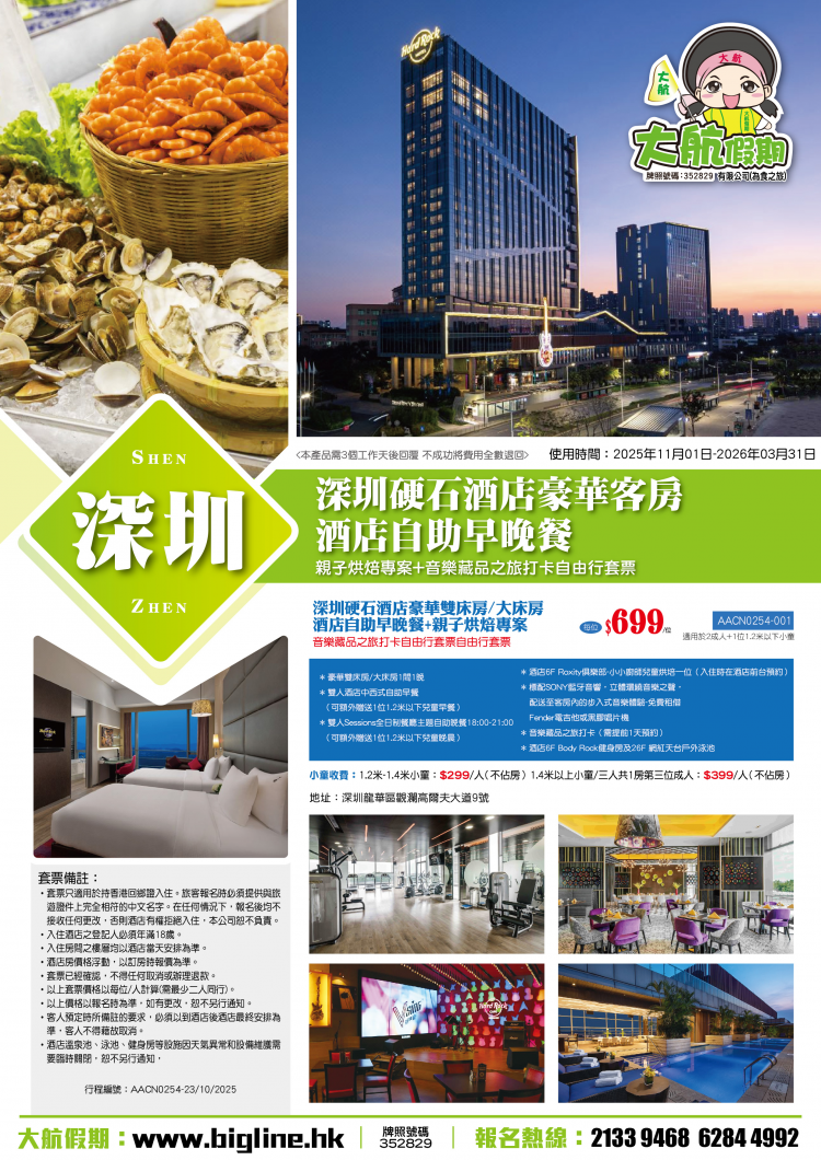 深圳硬石酒店Hard Rock Hote豪華客房+酒店自助早晚餐+親子烘焙專案+音樂藏品之旅打卡自由行套票