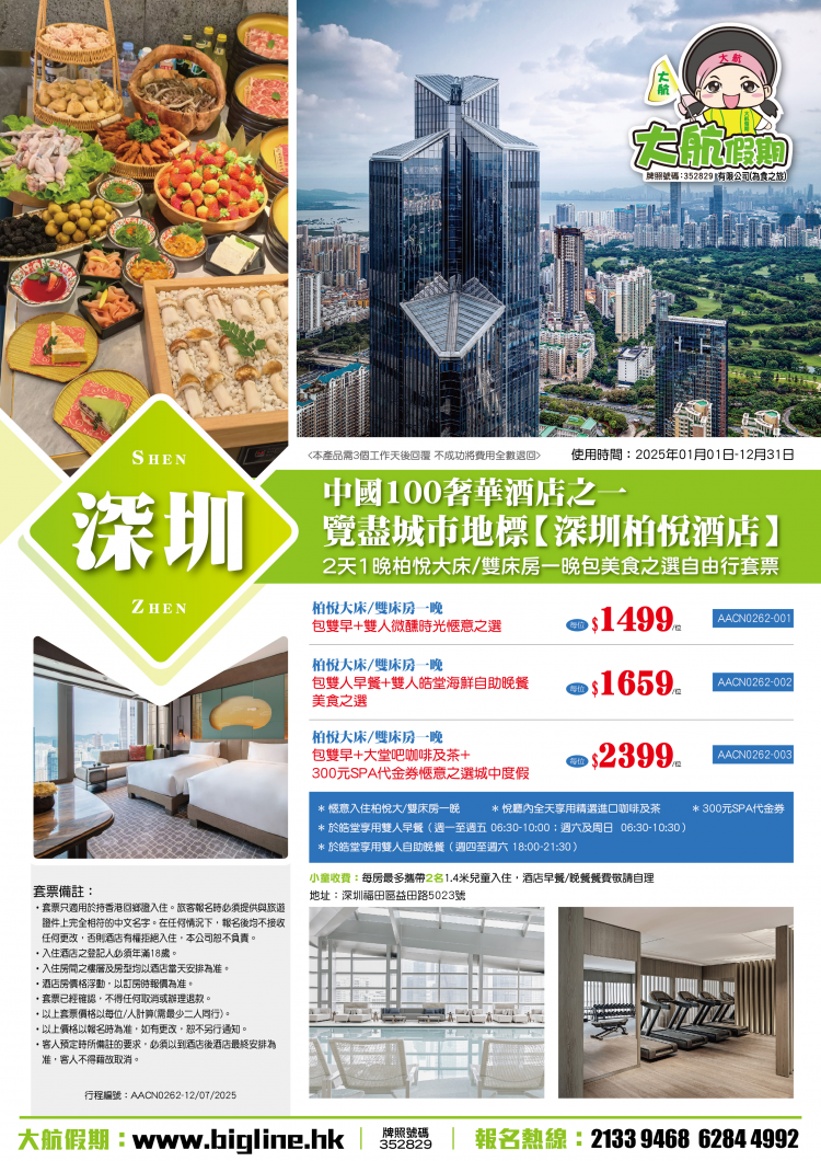 AACN0262-003 【深圳柏悅酒店】3天2晚柏悦大/双房含双早+大堂吧咖啡及茶+ 300元SPA代金券愜意之選城中度假自由行套票$2399/位