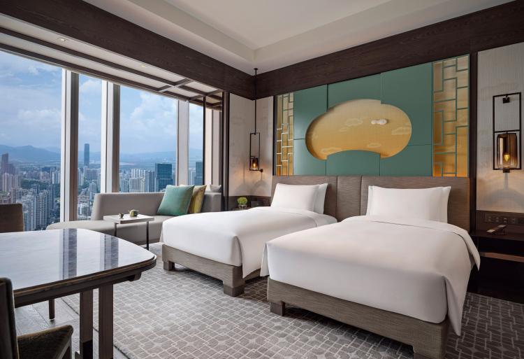 酒店擁有195間寬敞奢適的客房,其中包含24間套房。客房面積從48至300平方米不等,分布於酒店的36層至44層。 [2]客房的室內設計由設計師Yabu Pushelberg主理,每間客房均採用灰褐、赭石為主色調搭配原木傢具陳設。每個房間均配有全景落地窗,讓賓客可以全方位欣賞福田商務金融中心的城市景觀,部分客房還可遠眺深圳灣。