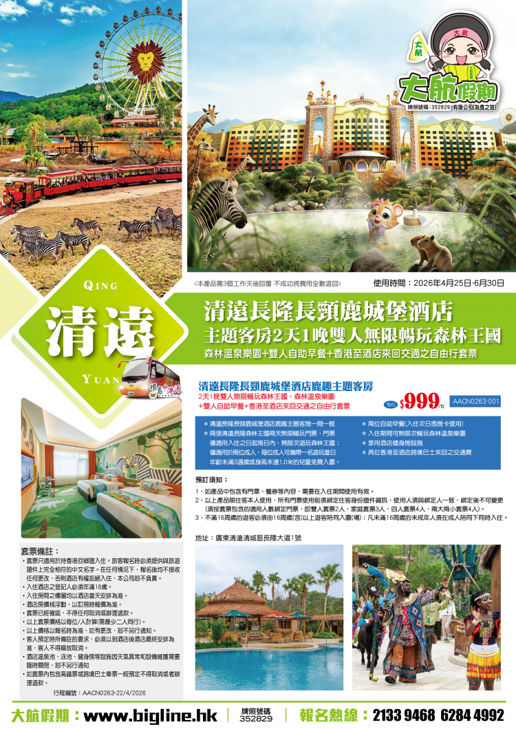 AACN0263-001 清遠長隆長頸鹿城堡酒店鹿趣主題客房+2天1晚雙人無限暢玩森林王國、森林溫泉樂園+雙人自助早餐+香港至酒店來回交通之自由行套票 $999/位起