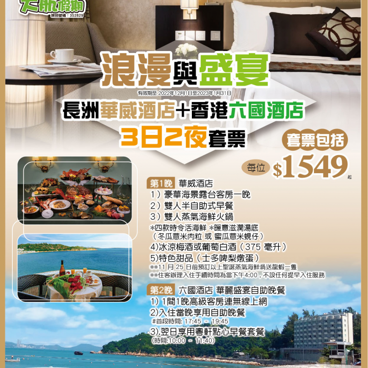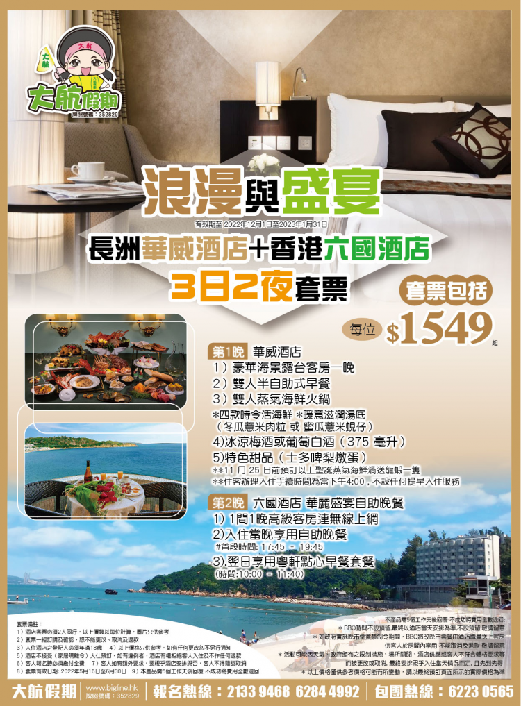 3天2晚套票(第1晚長洲華威酒店+第2晚六國酒店)