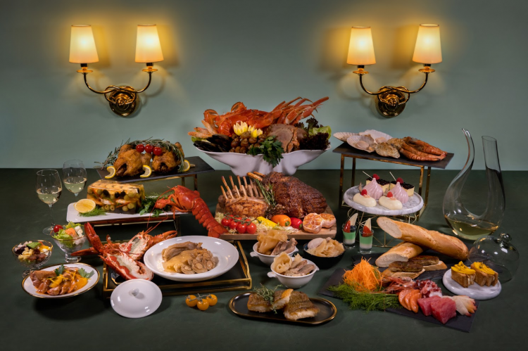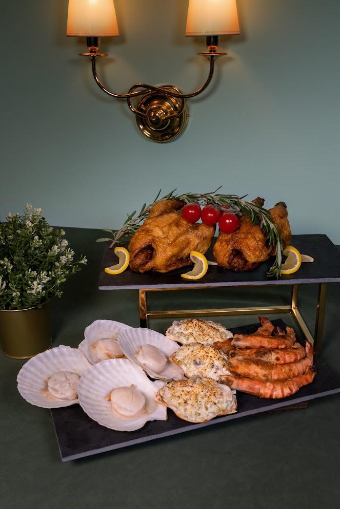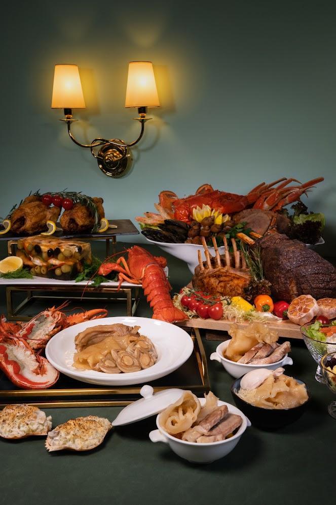 -熱盤:燴花膠、蠔皇扣鮑魚、蝦籽海參、清蒸星斑、片皮鵝、鐵板燒鴨肝、鐵板燒虎蝦、鐵板燒牛柳粒、鐵板煎威茉酒大蝦、美國特級有骨肉眼、約克郡布甸、白酒百里香煮藍青口、洋蔥煙肉焗蠔、芝士蘑菇焗蟹蓋、3.6牛乳海鮮蒸蛋白、清酒白麵豉龍蝦鉗、尼斯紅酒燉牛頰肉、龍蝦瑤柱炒飯