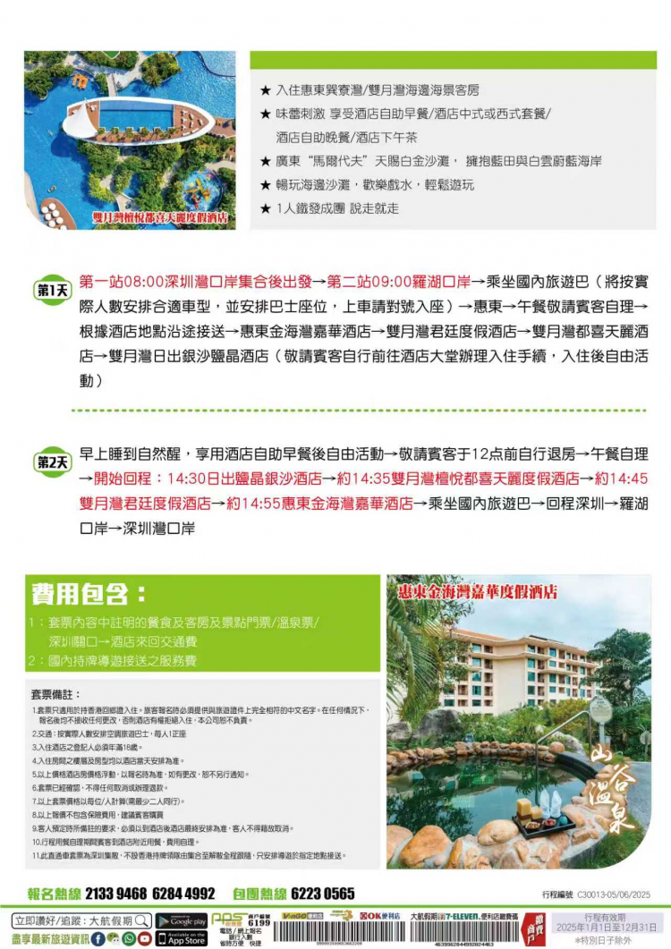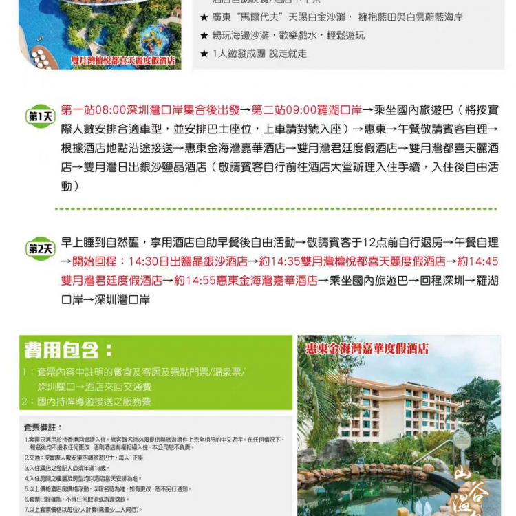 D1:第一站08:00深圳灣口岸集合後出發→第二站09:00羅湖口岸→乘坐國內旅遊巴(將按實際人數安排合適車型,並安排巴士座位,上車請對號入座)→惠東→午餐敬請賓客自理→根據酒店地點沿途接送→惠東金海灣嘉華酒店→雙月灣君廷度假酒店→雙月灣都喜天麗酒店→雙月灣日出銀沙鹽晶酒店(敬請賓客自行前往酒店大堂辦理入住手續,入住後自由活動)