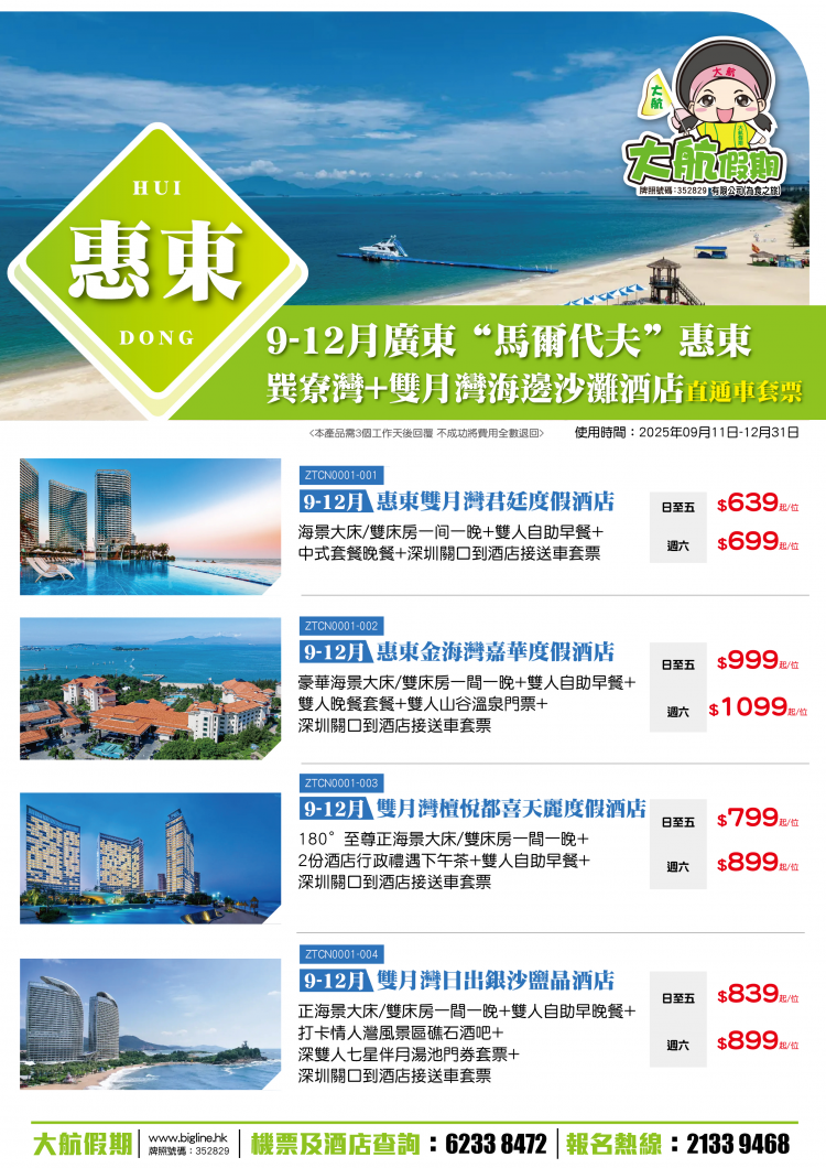 【廣東省直通車】9-12月廣東“馬爾代夫”惠東巽寮灣+雙月灣海邊沙灘酒店套票直通車
