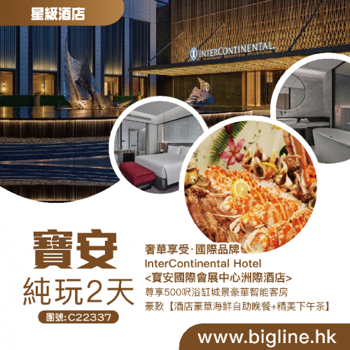 【星級酒店】奢華享受·國際品牌InterContinental Hotel<寶安國際會展中心洲際酒店>尊享500呎浴缸城景豪華智能客房 豪嘆【酒店豪華海鮮自助晚餐+精美下午茶】 純玩2天