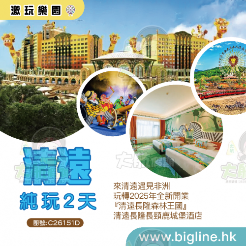 C26151D - 【激玩樂園】來清遠遇見非洲 玩轉 2025年全新開業『清遠長隆森林王國』& 清遠長隆長頸鹿城堡酒店 純玩2天