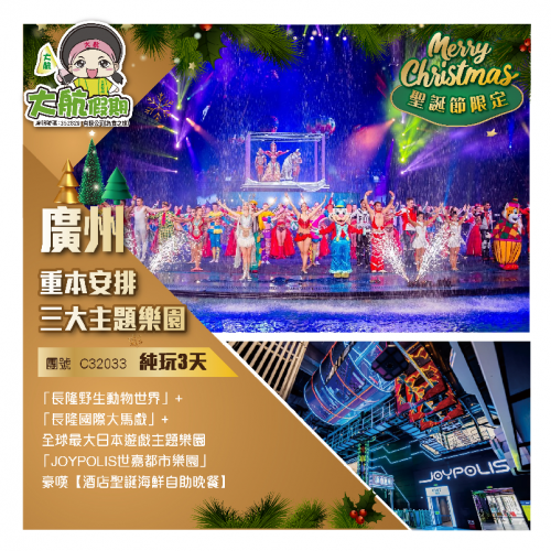 C32033 - 【聖誕節限定】重本安排三大主題樂園 「長隆野生動物世界」+「長隆國際大馬戲」+全球最大日本遊戲主題樂園「JOYPOLIS世嘉都市樂園」 豪嘆【酒店聖誕海鮮自助晚餐】 純玩3天