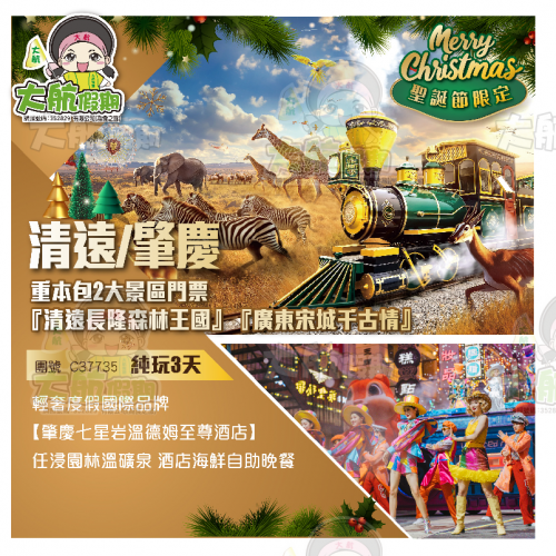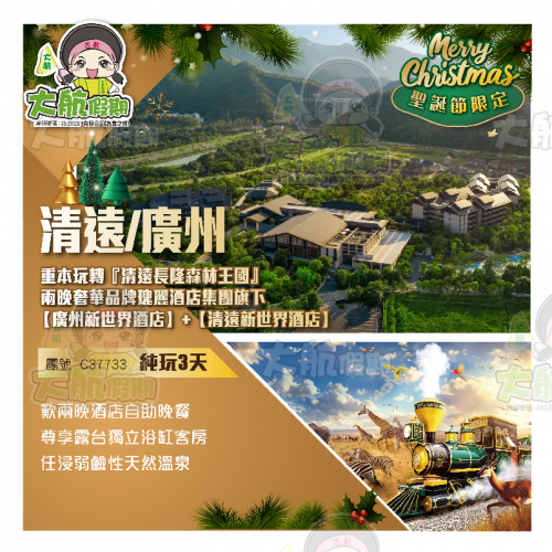 C37733 - 【聖誕節加班】重本玩轉『清遠長隆森林王國』兩晚奢華品牌瑰麗酒店集團旗下《廣州新世界酒店》+【清遠新世界酒店】歎兩晚酒店自助晚餐 尊享露台獨立浴缸客房 任浸弱鹼性天然溫泉 純玩3天
