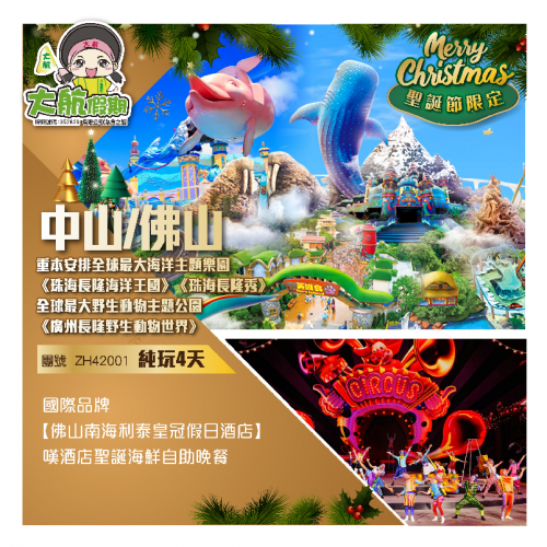 ZH42001 - 【香港出發】重本安排全球最大海洋主題樂園《珠海長隆海洋王國》《珠海長隆秀》全球最大野生動物主題公園《廣州長隆野生動物世界》國際品牌【佛山南海利泰皇冠假日酒店】嘆酒店聖誕海鮮自助晚餐 純玩4天