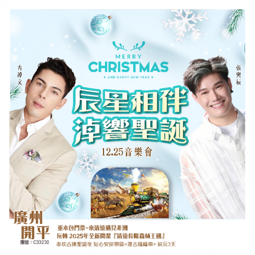 C33230 - <12.25張與辰+古淖文>《一等席座位票》“辰星相伴 淖響聖誕”音樂會 重本包門票~來清遠遇見非洲 玩轉 2025年全新開業『清遠長隆森林王國』+赤坎古鎮聖誕夜 貼心安排景區<復古鐺鐺車> 純玩3天