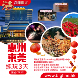 C38551 - 【春節限定】兩晚五星享受 2025年6全新裝修鬧市中心【東莞龍泉國際大酒店】+【惠東雙月灣泰麗雲頂度假酒店】 任浸全新暮光湯泉 歎兩晚酒店新春自助晚餐 夢幻新年煙花盛宴 任摘任食士多啤梨 純玩3天