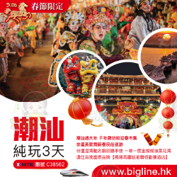 C38531 - 【春節限定】西九龍高鐵往返 潮汕年味盛宴 打卡潮汕非遺春節民俗活動 賞英歌舞表演 舞龍醒獅巡遊 古城燈會 包羅萬有潮粵菜任食放題 純玩3天