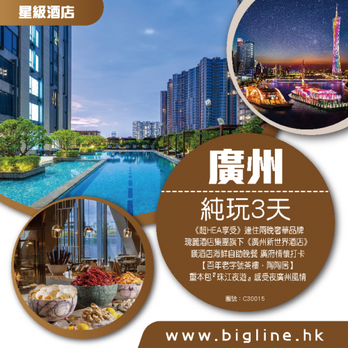 【星級酒店】《超HEA享受》連住兩晚奢華品牌瑰麗酒店集團旗下《廣州新世界酒店》嘆酒店海鮮自助晚餐 廣府情懷打卡【百年老字號茶樓·陶陶居】重本包『珠江夜遊』感受夜廣州風情 純玩3天