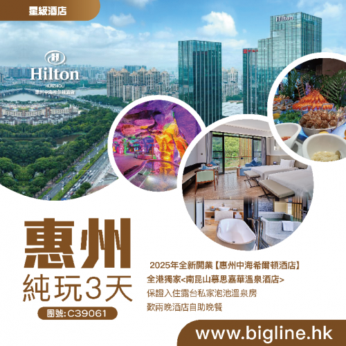 | 第2天 | 酒店自助早餐 | 招牌脆皮燒雞宴 | 酒店海鮮自助晚餐 | 惠州中海希爾頓酒店 |
