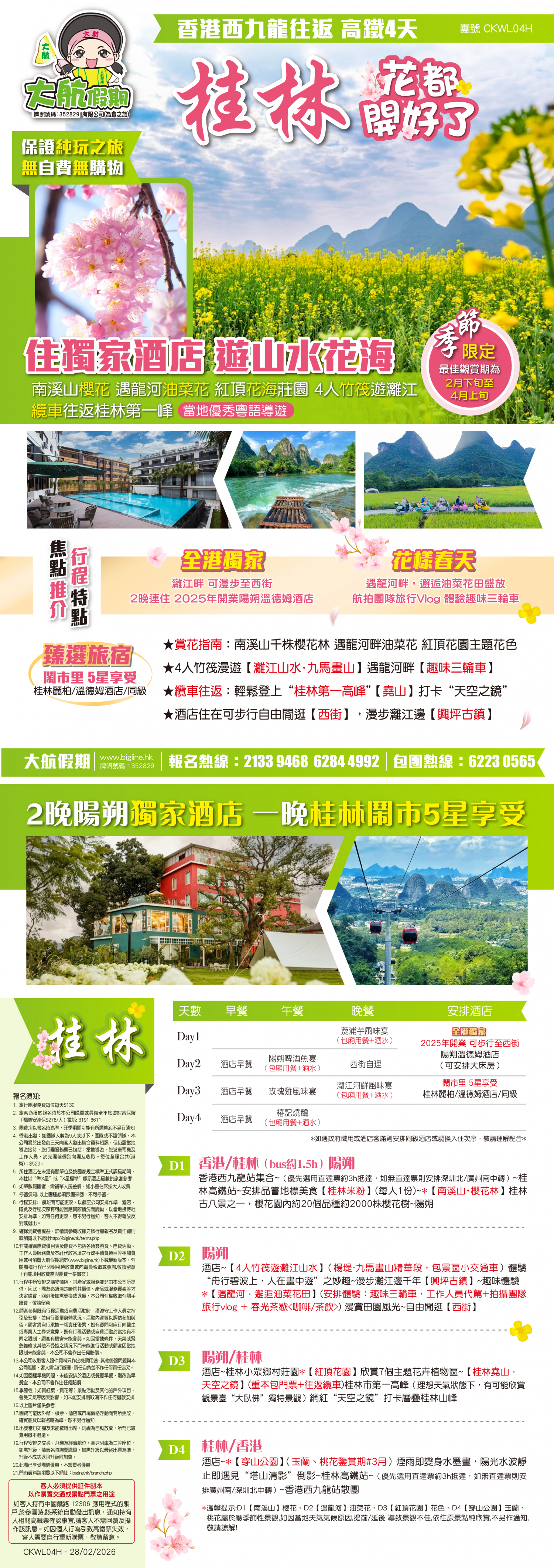 香港西九龍站集合~(優先選用直達票約3h抵達,如無直達票則安排深圳北/廣州南中轉)~桂林高鐵站~安排品嘗地標美食【桂林米粉】(每人1份)~*【南溪山・櫻花林】桂林古八景之一,櫻花園內約20個品種約2000株櫻花樹~陽朔