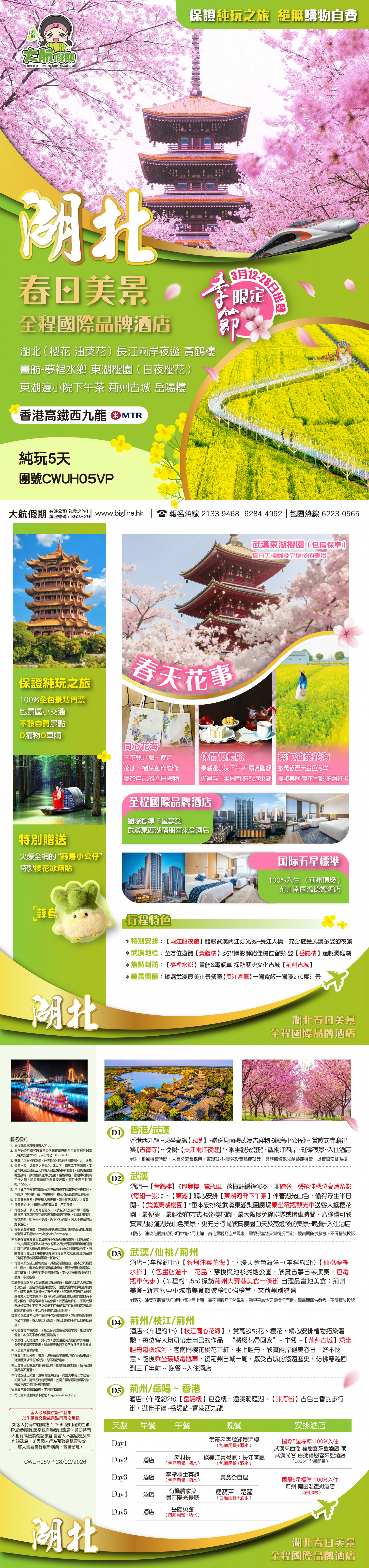 *團員繳付退票費後 (如適用): 1) 已繳款項可保留半年; 或 2) 選擇轉團後, 餘款則保留半年; 或 3) 可繳付『迫不得已理由』之手續費後, 取回已付餘款。 *個別機票+酒店套票產品如因『迫不得已理由』取消外遊行程, 處理旅客退款時亦按以上訂列收取每位退票費及手續費, 並以行程表 (套票單張) 所列為準。 責任細則: 1. 本公司保留合併團隊出發的權利。 2. 行程書或單張內所列費用根據當時機票價格及國際貨幣兌換率而訂立。外幣浮動等情況之下, 本公司保留在出發前調整各項費用的權利及徵收額外費用。 3. 所有列出的交通服務資料只供參考, 如有更改概不負責, 一切須以出票時為準。 4. 除本公司直接提供之服務外, 本公司及其職員或附屬公司或與本公司有經營關係之公司代理人身份在香港或外地安排其他獨立機構所提供之交通工具 (如飛機、輪船、火車、或遊覽巴士等) 、住宿、膳食或娛樂觀光項目等 (“委託機構”), 團員如遇交通延誤、行李遺失、意外傷亡或財物損失等, 該依照當地法律向擁有、管理或操作之委託機構直接交涉或追討賠償, 通常該等機構均各訂位不同條例, 以對客人負責。在此情況下, 本公司概不對該等損失或傷亡負責。 5. 除因由本公司之員工或其他直接管理或操作之機構之疏忽而引致團員之個人傷亡外, 本公司對團員在任何意外中之個人傷亡、經濟、娛樂或精神損失概不負責。 6. 除經本公司同意及安排, 如團員自行更改由其他人士代為參團, 本公司或其委託機構之職員有權取消其隨團之資格, 而無須發還任何團費, 而該人士在隨團期間之保險、責任賠償、行為後果等均由該人仕自行承擔。 7. 如因天氣、罷工、戰爭、怠工或安全情況影響而引致有關交通工具暫停服務, 停航或其他事故, 而必須將行程更改或取消部份行程, 本公司則將團員所繳交之費用扣除因以上事故而引致之損失後, 退回差額給團員。 8. 有關住宿、膳食、遊覽節目等問題, 均依據行程表安排, 行程先後次序有可能需要更改, 一切以當地安排為準。若遇特殊情況, 如簽證受阻, 當地酒店突告客滿或航機改變飛行時間或地點, 以及非本公司或其委託機構所能控制之因素, 令旅行團節目有增減, 或臨時更改交通工具、班機時間、機種及更換酒店等等, 本公司或其委託機構得依當時情況全權盡力處理, 團員不得藉故反對或退出, 因故取消之節目, 將不獲退還款項, 任何因延期而引致之額外支出, 本公司或其委託機構概不負責。 9. 所有酒店及住宿根據行程安排, 本公司視乎當時情形作出更改, 但不限於遇展覽會或特殊情況下, 將住宿鄰近城市之同等級酒店及住宿代替。本公司如因『迫不得已理由(外遊)』(即指戰爭、政治動盪、恐怖襲擊、天災、疫症、惡劣天氣、交通工具發生技術問題、載運機構臨時更改班次或取消服務、罷工、工業行動、旅遊目的地政府或世界衛生組織發出旅遊警示(警告)、香港特別行政區政府發出紅色或黑色外遊警示、不可抗力事件,以及業界不能控制的其他不利離開香港或在香港境外旅遊的情況)於外遊旅行團出發後更改任何項目而引致成本增加,可向顧客徵收額外費用。 10. 【已成團】代表該團號之指定出發日期預訂機位或已有足夠人數報名參加。但出發與否還受其他因素影響, 本公司保留最終決定權。 11. 任何團員在參與各項活動時, 如經常不遵守服飾人員之指引或安排, 在行動或言語上侮辱或滋擾其他團員或工作人員, 本公司或其委託機構職員有權視具體情況而取消其隨團資格而母須發任何團費, 而受該旅客監護之18歲以下同行團員亦須一併離開, 有關旅客離團後一切活動, 概與本公司或其委託機構無關。 12. 團員如欲於旅程完畢後延期返港, 須於出發前十四天提出, 以便本公司代為預定返港機位, 延期返港之機位, 未能即時作實, 團員不得藉此理由要求退出, 旅程完畢後延期逗留之費用, 概由團員自負。 13. 延期返港之團友, 必須在離境前七十二小時向航空公司確實回程機位, 任何機位如有變更, 概與本公司無關。 14. 團員如在旅途中自行離團或放棄行程, 離團後之責任自負, 一切後果與本公司或其委託機構無關。 15. 參團者須切實遵守各國及各地法例, 包括但不限於防疫防控條例, 並嚴禁攜帶違例物品出入境, 並照實申報攜帶之物品及現金。 16. 任何種類的簽證審批權及出入境批准權一律由該國或地區之領事館及/或出入境部門全權決定, 出入境如有問題, 責任旅客自負, 本公司或其委託機構母須負任何責任。如簽證已代辦, 簽證費恕不退還。 17. 即使團員持有效之入境簽證及旅遊證件, 而於入境時被當值之移民局海關人員拒絕入境, 本公司或其委託機構亦無須負任何責任。所需額外安排之食宿、交通費用、全部由其本人負責, 其餘下的行程亦將不會獲得任何補償, 亦不得要求退款或改團。 18. 中國內地相關法規規定, 即日起旅客入住中國內地境內酒店時, 公安機關會透過酒店前台向旅客一併採集人像信息資訊。 19. 如出現一些非本公司能力範圍可控制之問題 (如花卉、紅葉提早凋謝或景觀、自然現象、景點活動或戶外項目) 會受天氣等因素影響, 如未能安排則取消不作任何退款安排。 20. 旅客如在旅程中確診 COVID-19或其他傳染病,無論受到當地政府隔離或其他檢疫要求影響與否,為確保其他旅客之安全,確診旅