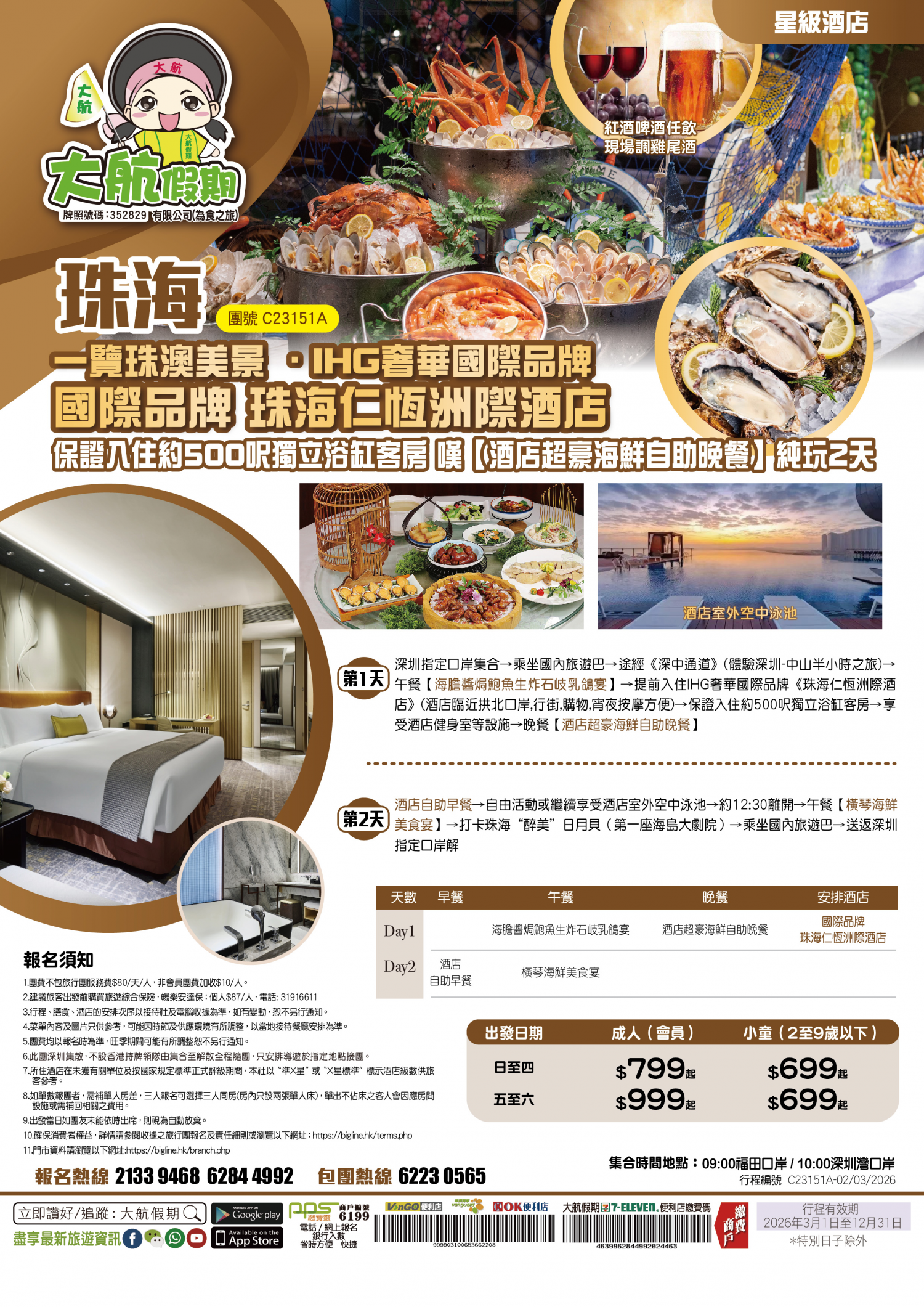 | 第2天 | 酒店自助早餐 | 橫琴海鮮美食宴 |