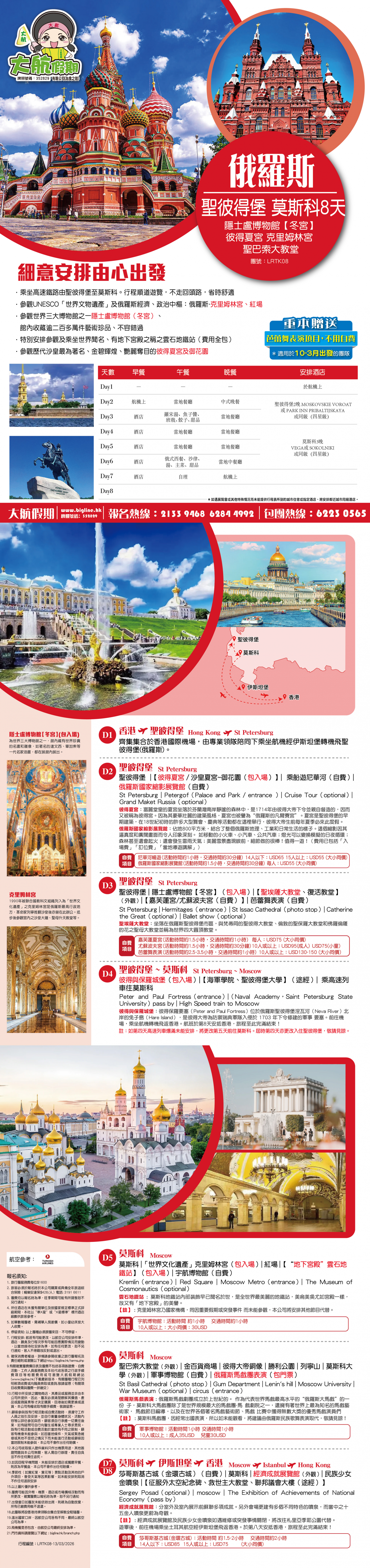 註: 克里姆林宮乃國家機構,同因重要假期或突發事件而未能參觀,本公司將安排其他節目代替