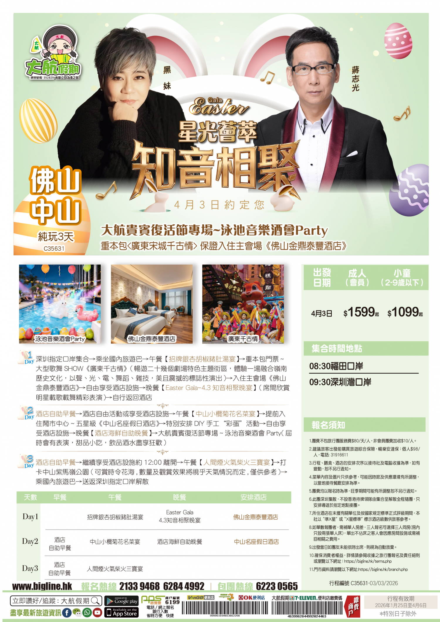 | 第1天 | 東莞必食園林食府·招牌銀杏胡椒豬肚湯宴 | EasterGala~4.3知音相聚晚宴 | 佛山金鼎泰豐酒店 | |