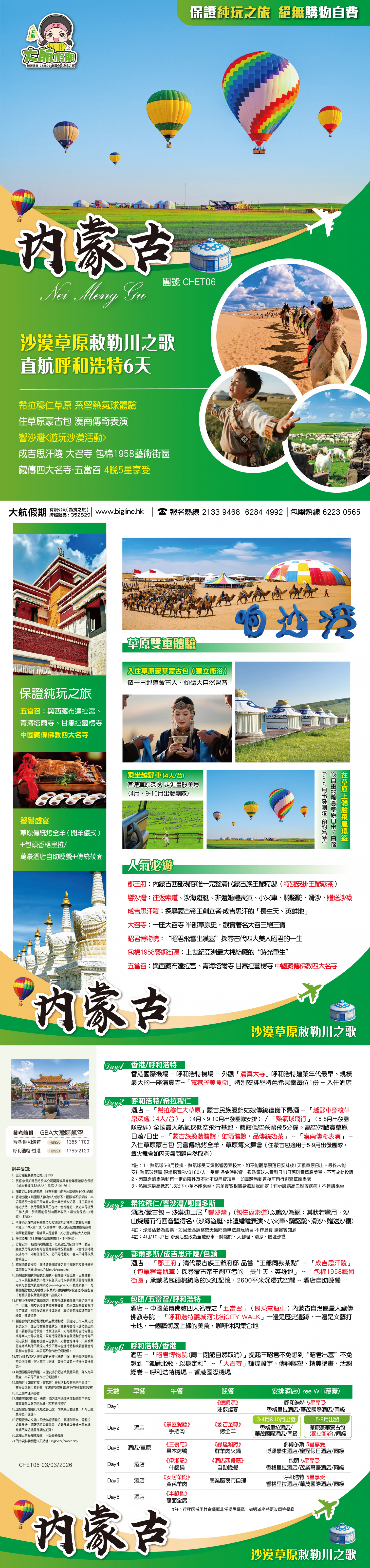 內蒙古#敕勒川之歌 直航呼和浩特 「希拉穆仁草原<系留熱氣球體驗/越野車穿梭 住蒙古包 漠南傳奇表演>」 響沙灣<遊玩沙漠活動> 成吉思汗陵 大召寺 藏傳四大名寺-五當召 4晚5星享受 6天