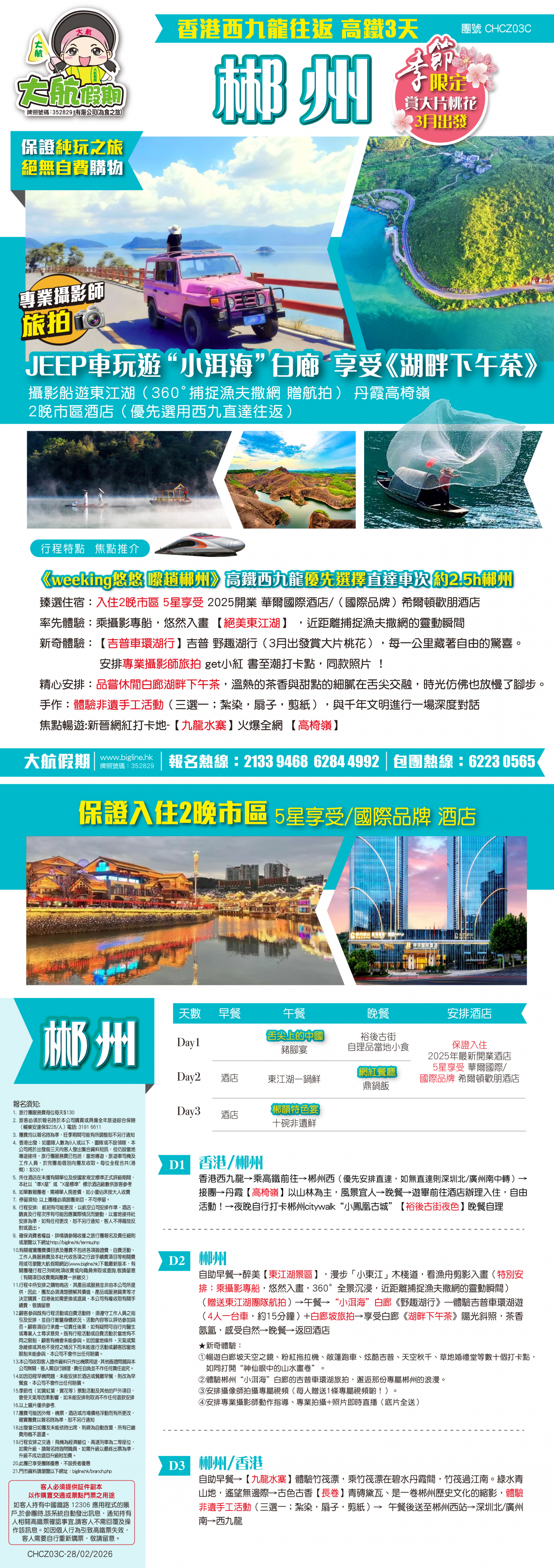 自助早餐→【九龍水寨】體驗竹筏漂, 乘竹筏漂在碧水丹霞間,竹筏過江南。綠水青山地,遙望無邊際→古色古香【長卷】青磚黛瓦、是一卷郴州歷史文化的縮影(體驗非遺手工活動(三選一;紮染,扇子,剪紙)→ 午餐後送至郴州西站→深圳北/廣州南→西九龍