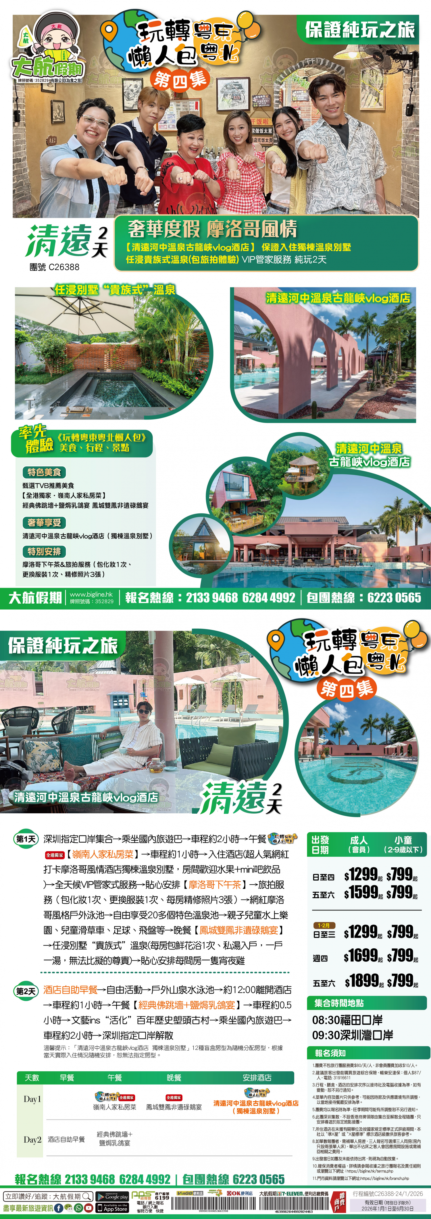 | 第1天 | 甄選TVB推薦美食【全港獨家·嶺南人家私房菜】 | 鳳城雙鳳非遺碌鵝宴 | 河中溫泉古龍峽VLOG酒店 | |