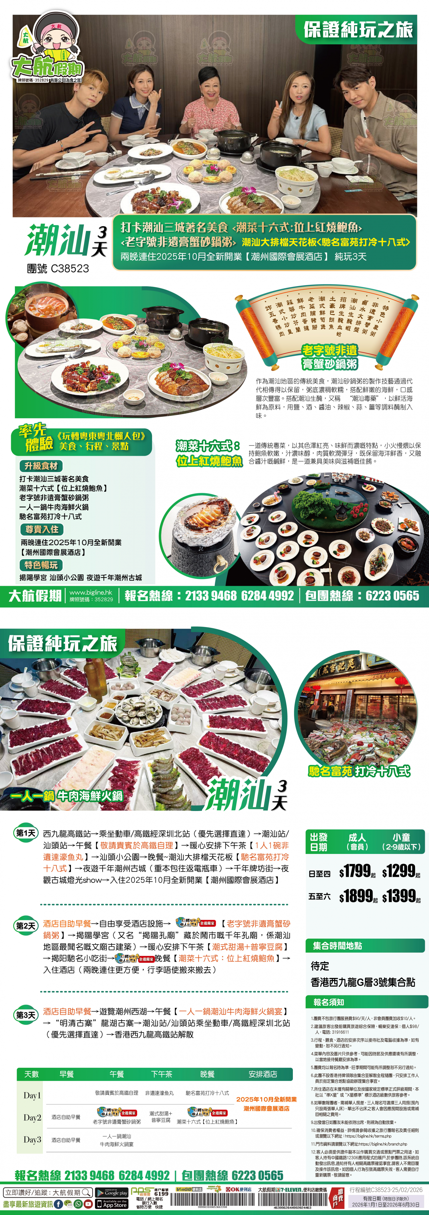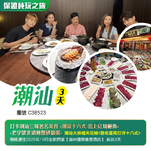 | 第1天 | 客人自理 | 馳名富苑打冷十八式 | 潮州國際會展酒店 | |