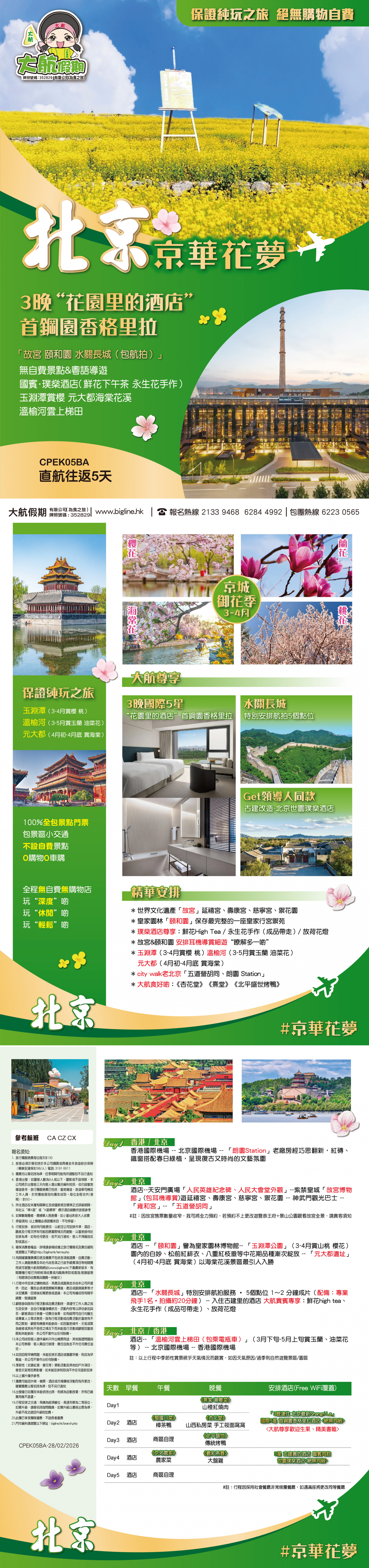 .酒店-- 「溫榆河雲上梯田(包乘電瓶車)」(3月下旬-5月上旬賞玉蘭、油菜花等) -- 北京國際機場 -- 香港國際機場