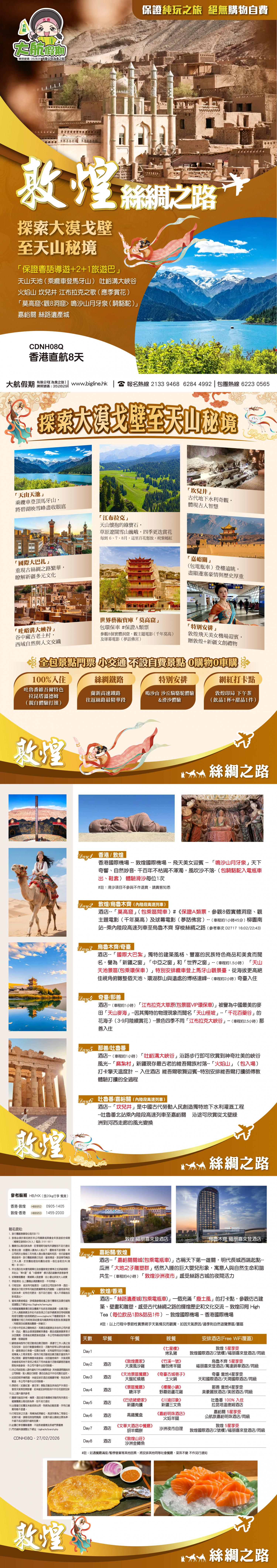 .酒店--「絲路遺產城(包乘電瓶車)」一個充滿「廢土風」的打卡點,參觀仿古建築、壁畫和雕塑,感受古代絲綢之路的輝煌歷史和文化交流 -- 敦煌印局 High Tea(每位飲品1款&甜品1件) -- 敦煌國際機場 -- 香港國際機場