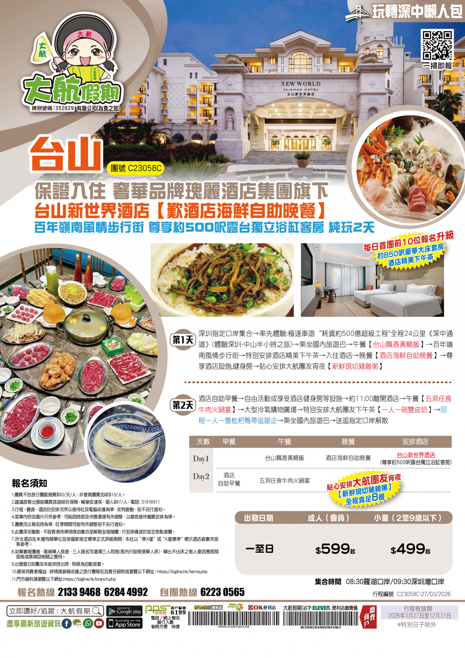 | 第1天 | 台山飄香黃鱔飯 | 酒店海鮮自助晚餐 | 台山新世界酒店 | |