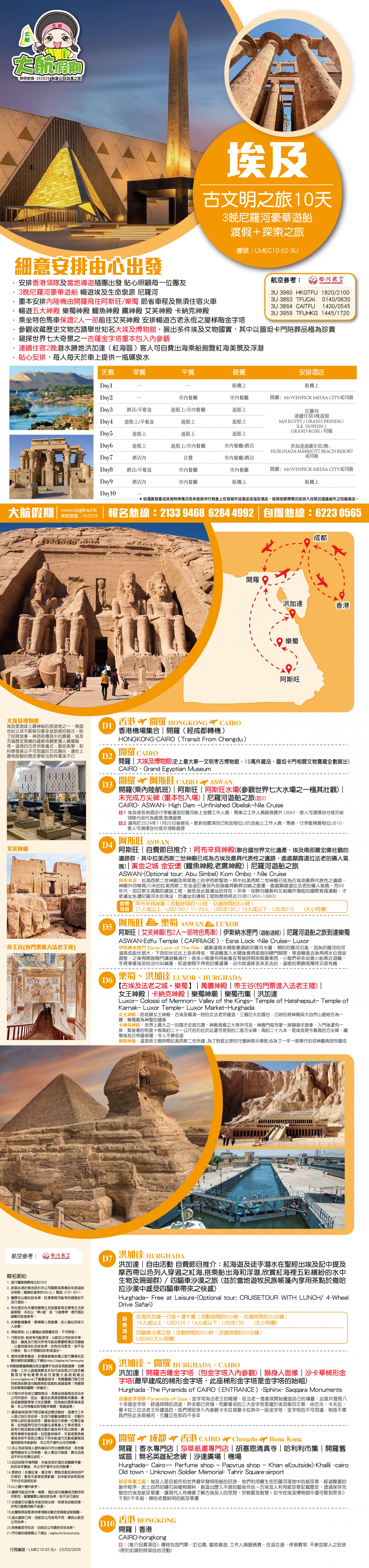 古埃及法老之城-樂蜀~萬儂神殿(兩尊曼儂巨像)~帝王谷(包門票進入法老王陵)~女王神殿 (哈姬蘇女王神殿 ,古埃及權清一時的女法老所建造,三層巨大的露台,巧妙的將神殿與大自然山壁結合為一體,樂蜀最為神聖的建築) 卡納克神殿(世界上最大之一的露天史前古蹟,神殿規模之大無所可及,神殿門前列著一排獅身羊面像,入門後還有一排,緊接著的則是十根高約二十一公尺的石柱,於此還可見到的二座方尖碑,高約二十九米,是埃及現今最高的方尖碑,緬懷埃及古帝國榮耀,令人不勝低迴)~樂蜀神廟~(這是新王朝時期拉美西斯二世所建 ,為了對底比斯的守護神表示尊敬,也為了一年一度舉行的迎神慶典因而建成) ~樂蜀市集~洪加達