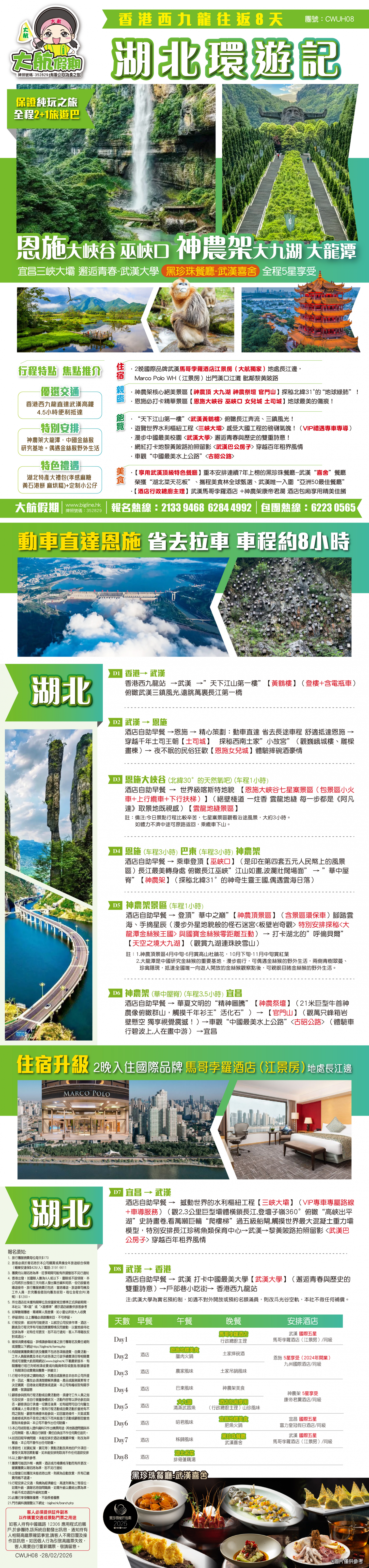 *團員繳付退票費後 (如適用): 1) 已繳款項可保留半年; 或 2) 選擇轉團後, 餘款則保留半年; 或 3) 可繳付『迫不得已理由』之手續費後, 取回已付餘款。 *個別機票+酒店套票產品如因『迫不得已理由』取消外遊行程, 處理旅客退款時亦按以上訂列收取每位退票費及手續費, 並以行程表 (套票單張) 所列為準。 責任細則: 1. 本公司保留合併團隊出發的權利。 2. 行程書或單張內所列費用根據當時機票價格及國際貨幣兌換率而訂立。外幣浮動等情況之下, 本公司保留在出發前調整各項費用的權利及徵收額外費用。 3. 所有列出的交通服務資料只供參考, 如有更改概不負責, 一切須以出票時為準。 4. 除本公司直接提供之服務外, 本公司及其職員或附屬公司或與本公司有經營關係之公司代理人身份在香港或外地安排其他獨立機構所提供之交通工具 (如飛機、輪船、火車、或遊覽巴士等) 、住宿、膳食或娛樂觀光項目等 (“委託機構”), 團員如遇交通延誤、行李遺失、意外傷亡或財物損失等, 該依照當地法律向擁有、管理或操作之委託機構直接交涉或追討賠償, 通常該等機構均各訂位不同條例, 以對客人負責。在此情況下, 本公司概不對該等損失或傷亡負責。 5. 除因由本公司之員工或其他直接管理或操作之機構之疏忽而引致團員之個人傷亡外, 本公司對團員在任何意外中之個人傷亡、經濟、娛樂或精神損失概不負責。 6. 除經本公司同意及安排, 如團員自行更改由其他人士代為參團, 本公司或其委託機構之職員有權取消其隨團之資格, 而無須發還任何團費, 而該人士在隨團期間之保險、責任賠償、行為後果等均由該人仕自行承擔。 7. 如因天氣、罷工、戰爭、怠工或安全情況影響而引致有關交通工具暫停服務, 停航或其他事故, 而必須將行程更改或取消部份行程, 本公司則將團員所繳交之費用扣除因以上事故而引致之損失後, 退回差額給團員。 8. 有關住宿、膳食、遊覽節目等問題, 均依據行程表安排, 行程先後次序有可能需要更改, 一切以當地安排為準。若遇特殊情況, 如簽證受阻, 當地酒店突告客滿或航機改變飛行時間或地點, 以及非本公司或其委託機構所能控制之因素, 令旅行團節目有增減, 或臨時更改交通工具、班機時間、機種及更換酒店等等, 本公司或其委託機構得依當時情況全權盡力處理, 團員不得藉故反對或退出, 因故取消之節目, 將不獲退還款項, 任何因延期而引致之額外支出, 本公司或其委託機構概不負責。 9. 所有酒店及住宿根據行程安排, 本公司視乎當時情形作出更改, 但不限於遇展覽會或特殊情況下, 將住宿鄰近城市之同等級酒店及住宿代替。本公司如因『迫不得已理由(外遊)』(即指戰爭、政治動盪、恐怖襲擊、天災、疫症、惡劣天氣、交通工具發生技術問題、載運機構臨時更改班次或取消服務、罷工、工業行動、旅遊目的地政府或世界衛生組織發出旅遊警示(警告)、香港特別行政區政府發出紅色或黑色外遊警示、不可抗力事件,以及業界不能控制的其他不利離開香港或在香港境外旅遊的情況)於外遊旅行團出發後更改任何項目而引致成本增加,可向顧客徵收額外費用。 10. 【已成團】代表該團號之指定出發日期預訂機位或已有足夠人數報名參加。但出發與否還受其他因素影響, 本公司保留最終決定權。 11. 任何團員在參與各項活動時, 如經常不遵守服飾人員之指引或安排, 在行動或言語上侮辱或滋擾其他團員或工作人員, 本公司或其委託機構職員有權視具體情況而取消其隨團資格而母須發任何團費, 而受該旅客監護之18歲以下同行團員亦須一併離開, 有關旅客離團後一切活動, 概與本公司或其委託機構無關。 12. 團員如欲於旅程完畢後延期返港, 須於出發前十四天提出, 以便本公司代為預定返港機位, 延期返港之機位, 未能即時作實, 團員不得藉此理由要求退出, 旅程完畢後延期逗留之費用, 概由團員自負。 13. 延期返港之團友, 必須在離境前七十二小時向航空公司確實回程機位, 任何機位如有變更, 概與本公司無關。 14. 團員如在旅途中自行離團或放棄行程, 離團後之責任自負, 一切後果與本公司或其委託機構無關。 15. 參團者須切實遵守各國及各地法例, 包括但不限於防疫防控條例, 並嚴禁攜帶違例物品出入境, 並照實申報攜帶之物品及現金。 16. 任何種類的簽證審批權及出入境批准權一律由該國或地區之領事館及/或出入境部門全權決定, 出入境如有問題, 責任旅客自負, 本公司或其委託機構母須負任何責任。如簽證已代辦, 簽證費恕不退還。 17. 即使團員持有效之入境簽證及旅遊證件, 而於入境時被當值之移民局海關人員拒絕入境, 本公司或其委託機構亦無須負任何責任。所需額外安排之食宿、交通費用、全部由其本人負責, 其餘下的行程亦將不會獲得任何補償, 亦不得要求退款或改團。 18. 中國內地相關法規規定, 即日起旅客入住中國內地境內酒店時, 公安機關會透過酒店前台向旅客一併採集人像信息資訊。 19. 如出現一些非本公司能力範圍可控制之問題 (如花卉、紅葉提早凋謝或景觀、自然現象、景點活動或戶外項目) 會受天氣等因素影響, 如未能安排則取消不作任何退款安排。 20. 旅客如在旅程中確診 COVID-19或其他傳染病,無論受到當地政府隔離或其他檢疫要求影響與否,為確保其他旅客之安全,確診旅