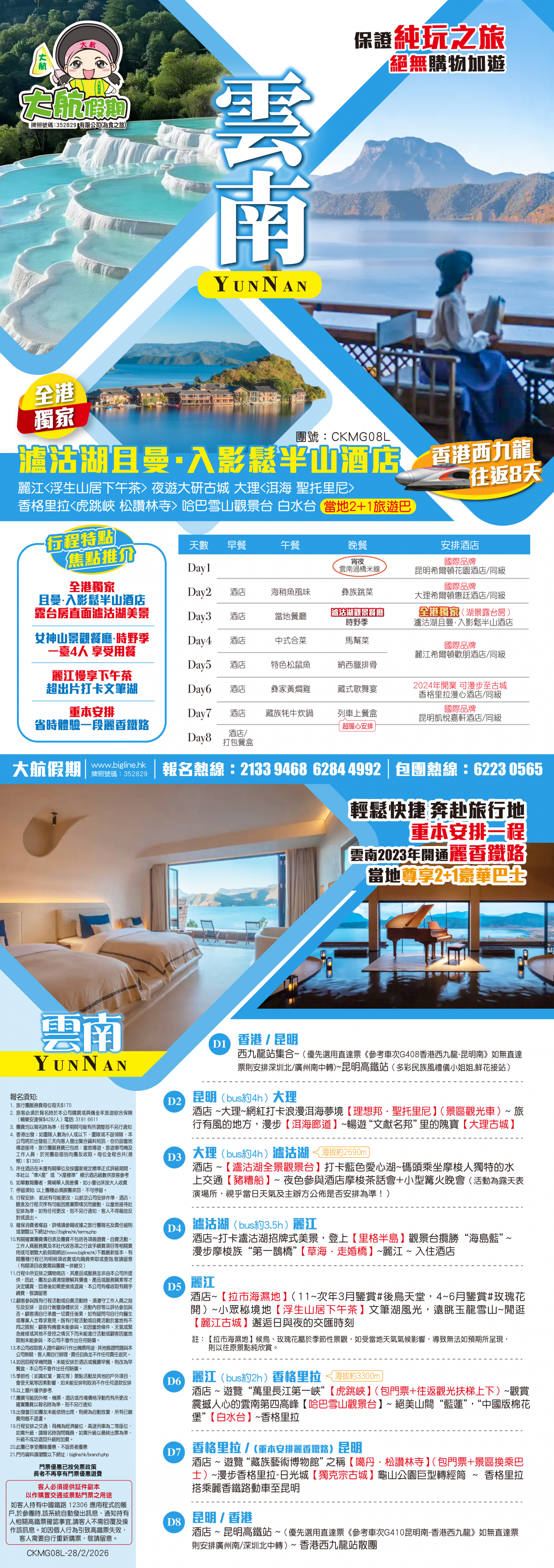 *團員繳付退票費後 (如適用): 1) 已繳款項可保留半年; 或 2) 選擇轉團後, 餘款則保留半年; 或 3) 可繳付『迫不得已理由』之手續費後, 取回已付餘款。 *個別機票+酒店套票產品如因『迫不得已理由』取消外遊行程, 處理旅客退款時亦按以上訂列收取每位退票費及手續費, 並以行程表 (套票單張) 所列為準。 責任細則: 1. 本公司保留合併團隊出發的權利。 2. 行程書或單張內所列費用根據當時機票價格及國際貨幣兌換率而訂立。外幣浮動等情況之下, 本公司保留在出發前調整各項費用的權利及徵收額外費用。 3. 所有列出的交通服務資料只供參考, 如有更改概不負責, 一切須以出票時為準。 4. 除本公司直接提供之服務外, 本公司及其職員或附屬公司或與本公司有經營關係之公司代理人身份在香港或外地安排其他獨立機構所提供之交通工具 (如飛機、輪船、火車、或遊覽巴士等) 、住宿、膳食或娛樂觀光項目等 (“委託機構”), 團員如遇交通延誤、行李遺失、意外傷亡或財物損失等, 該依照當地法律向擁有、管理或操作之委託機構直接交涉或追討賠償, 通常該等機構均各訂位不同條例, 以對客人負責。在此情況下, 本公司概不對該等損失或傷亡負責。 5. 除因由本公司之員工或其他直接管理或操作之機構之疏忽而引致團員之個人傷亡外, 本公司對團員在任何意外中之個人傷亡、經濟、娛樂或精神損失概不負責。 6. 除經本公司同意及安排, 如團員自行更改由其他人士代為參團, 本公司或其委託機構之職員有權取消其隨團之資格, 而無須發還任何團費, 而該人士在隨團期間之保險、責任賠償、行為後果等均由該人仕自行承擔。 7. 如因天氣、罷工、戰爭、怠工或安全情況影響而引致有關交通工具暫停服務, 停航或其他事故, 而必須將行程更改或取消部份行程, 本公司則將團員所繳交之費用扣除因以上事故而引致之損失後, 退回差額給團員。 8. 有關住宿、膳食、遊覽節目等問題, 均依據行程表安排, 行程先後次序有可能需要更改, 一切以當地安排為準。若遇特殊情況, 如簽證受阻, 當地酒店突告客滿或航機改變飛行時間或地點, 以及非本公司或其委託機構所能控制之因素, 令旅行團節目有增減, 或臨時更改交通工具、班機時間、機種及更換酒店等等, 本公司或其委託機構得依當時情況全權盡力處理, 團員不得藉故反對或退出, 因故取消之節目, 將不獲退還款項, 任何因延期而引致之額外支出, 本公司或其委託機構概不負責。 9. 所有酒店及住宿根據行程安排, 本公司視乎當時情形作出更改, 但不限於遇展覽會或特殊情況下, 將住宿鄰近城市之同等級酒店及住宿代替。本公司如因『迫不得已理由(外遊)』(即指戰爭、政治動盪、恐怖襲擊、天災、疫症、惡劣天氣、交通工具發生技術問題、載運機構臨時更改班次或取消服務、罷工、工業行動、旅遊目的地政府或世界衛生組織發出旅遊警示(警告)、香港特別行政區政府發出紅色或黑色外遊警示、不可抗力事件,以及業界不能控制的其他不利離開香港或在香港境外旅遊的情況)於外遊旅行團出發後更改任何項目而引致成本增加,可向顧客徵收額外費用。 10. 【已成團】代表該團號之指定出發日期預訂機位或已有足夠人數報名參加。但出發與否還受其他因素影響, 本公司保留最終決定權。 11. 任何團員在參與各項活動時, 如經常不遵守服飾人員之指引或安排, 在行動或言語上侮辱或滋擾其他團員或工作人員, 本公司或其委託機構職員有權視具體情況而取消其隨團資格而母須發任何團費, 而受該旅客監護之18歲以下同行團員亦須一併離開, 有關旅客離團後一切活動, 概與本公司或其委託機構無關。 12. 團員如欲於旅程完畢後延期返港, 須於出發前十四天提出, 以便本公司代為預定返港機位, 延期返港之機位, 未能即時作實, 團員不得藉此理由要求退出, 旅程完畢後延期逗留之費用, 概由團員自負。 13. 延期返港之團友, 必須在離境前七十二小時向航空公司確實回程機位, 任何機位如有變更, 概與本公司無關。 14. 團員如在旅途中自行離團或放棄行程, 離團後之責任自負, 一切後果與本公司或其委託機構無關。 15. 參團者須切實遵守各國及各地法例, 包括但不限於防疫防控條例, 並嚴禁攜帶違例物品出入境, 並照實申報攜帶之物品及現金。 16. 任何種類的簽證審批權及出入境批准權一律由該國或地區之領事館及/或出入境部門全權決定, 出入境如有問題, 責任旅客自負, 本公司或其委託機構母須負任何責任。如簽證已代辦, 簽證費恕不退還。 17. 即使團員持有效之入境簽證及旅遊證件, 而於入境時被當值之移民局海關人員拒絕入境, 本公司或其委託機構亦無須負任何責任。所需額外安排之食宿、交通費用、全部由其本人負責, 其餘下的行程亦將不會獲得任何補償, 亦不得要求退款或改團。 18. 中國內地相關法規規定, 即日起旅客入住中國內地境內酒店時, 公安機關會透過酒店前台向旅客一併採集人像信息資訊。 19. 如出現一些非本公司能力範圍可控制之問題 (如花卉、紅葉提早凋謝或景觀、自然現象、景點活動或戶外項目) 會受天氣等因素影響, 如未能安排則取消不作任何退款安排。 20. 旅客如在旅程中確診 COVID-19或其他傳染病,無論受到當地政府隔離或其他檢疫要求影響與否,為確保其他旅客之安全,確診旅