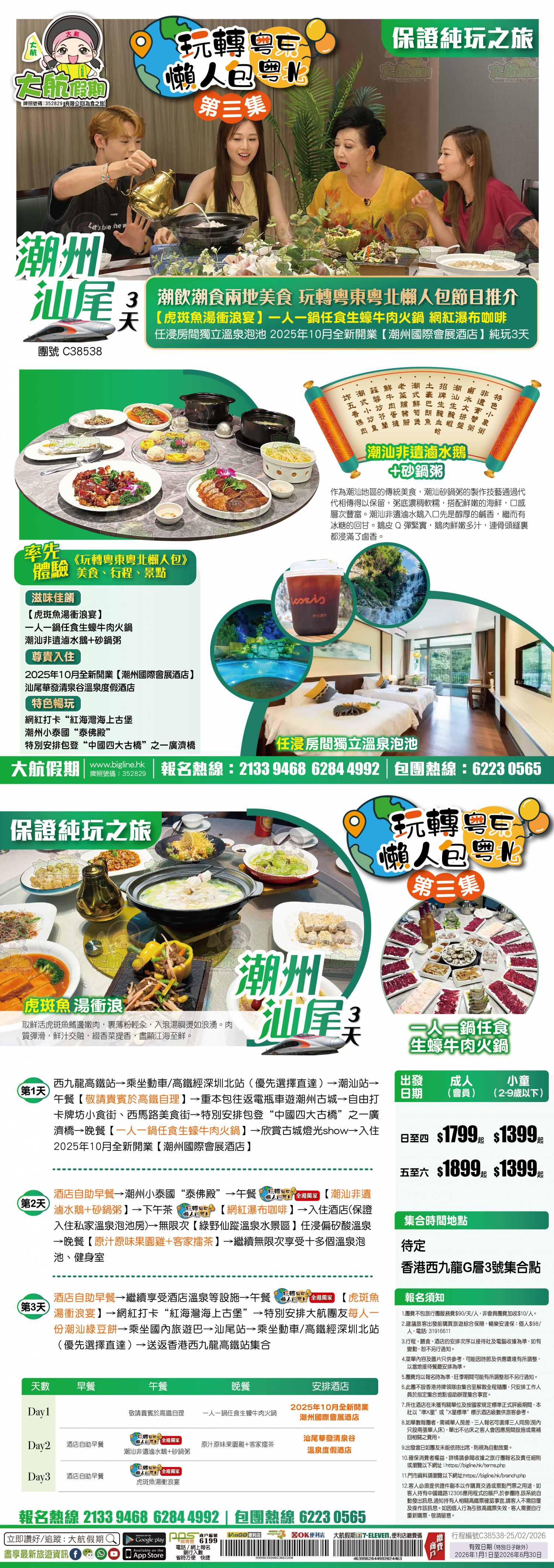 | 第2天 | 自助早餐 | 潮汕非遺滷水鵝+砂鍋粥 | 原汁原味果園雞+客家擂茶 | 汕尾華發清泉谷溫泉度假酒店 |