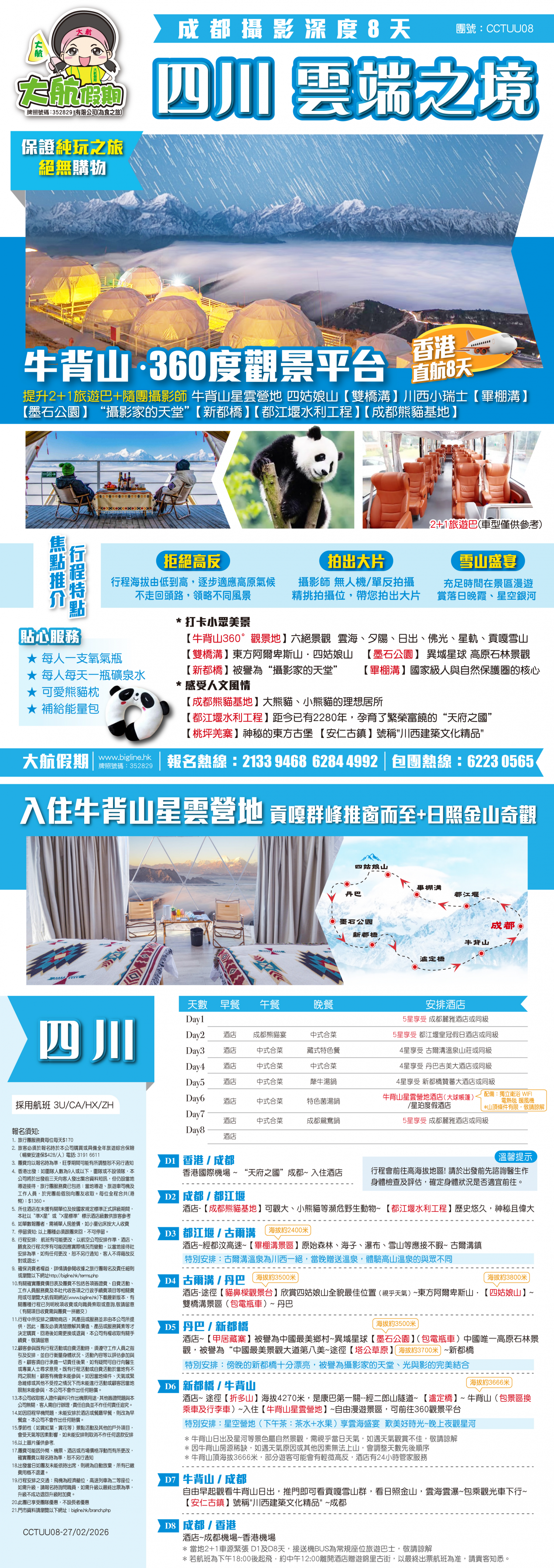 *團員繳付退票費後 (如適用): 1) 已繳款項可保留半年; 或 2) 選擇轉團後, 餘款則保留半年; 或 3) 可繳付『迫不得已理由』之手續費後, 取回已付餘款。 *個別機票+酒店套票產品如因『迫不得已理由』取消外遊行程, 處理旅客退款時亦按以上訂列收取每位退票費及手續費, 並以行程表 (套票單張) 所列為準。 責任細則: 1. 本公司保留合併團隊出發的權利。 2. 行程書或單張內所列費用根據當時機票價格及國際貨幣兌換率而訂立。外幣浮動等情況之下, 本公司保留在出發前調整各項費用的權利及徵收額外費用。 3. 所有列出的交通服務資料只供參考, 如有更改概不負責, 一切須以出票時為準。 4. 除本公司直接提供之服務外, 本公司及其職員或附屬公司或與本公司有經營關係之公司代理人身份在香港或外地安排其他獨立機構所提供之交通工具 (如飛機、輪船、火車、或遊覽巴士等) 、住宿、膳食或娛樂觀光項目等 (“委託機構”), 團員如遇交通延誤、行李遺失、意外傷亡或財物損失等, 該依照當地法律向擁有、管理或操作之委託機構直接交涉或追討賠償, 通常該等機構均各訂位不同條例, 以對客人負責。在此情況下, 本公司概不對該等損失或傷亡負責。 5. 除因由本公司之員工或其他直接管理或操作之機構之疏忽而引致團員之個人傷亡外, 本公司對團員在任何意外中之個人傷亡、經濟、娛樂或精神損失概不負責。 6. 除經本公司同意及安排, 如團員自行更改由其他人士代為參團, 本公司或其委託機構之職員有權取消其隨團之資格, 而無須發還任何團費, 而該人士在隨團期間之保險、責任賠償、行為後果等均由該人仕自行承擔。 7. 如因天氣、罷工、戰爭、怠工或安全情況影響而引致有關交通工具暫停服務, 停航或其他事故, 而必須將行程更改或取消部份行程, 本公司則將團員所繳交之費用扣除因以上事故而引致之損失後, 退回差額給團員。 8. 有關住宿、膳食、遊覽節目等問題, 均依據行程表安排, 行程先後次序有可能需要更改, 一切以當地安排為準。若遇特殊情況, 如簽證受阻, 當地酒店突告客滿或航機改變飛行時間或地點, 以及非本公司或其委託機構所能控制之因素, 令旅行團節目有增減, 或臨時更改交通工具、班機時間、機種及更換酒店等等, 本公司或其委託機構得依當時情況全權盡力處理, 團員不得藉故反對或退出, 因故取消之節目, 將不獲退還款項, 任何因延期而引致之額外支出, 本公司或其委託機構概不負責。 9. 所有酒店及住宿根據行程安排, 本公司視乎當時情形作出更改, 但不限於遇展覽會或特殊情況下, 將住宿鄰近城市之同等級酒店及住宿代替。本公司如因『迫不得已理由(外遊)』(即指戰爭、政治動盪、恐怖襲擊、天災、疫症、惡劣天氣、交通工具發生技術問題、載運機構臨時更改班次或取消服務、罷工、工業行動、旅遊目的地政府或世界衛生組織發出旅遊警示(警告)、香港特別行政區政府發出紅色或黑色外遊警示、不可抗力事件,以及業界不能控制的其他不利離開香港或在香港境外旅遊的情況)於外遊旅行團出發後更改任何項目而引致成本增加,可向顧客徵收額外費用。 10. 【已成團】代表該團號之指定出發日期預訂機位或已有足夠人數報名參加。但出發與否還受其他因素影響, 本公司保留最終決定權。 11. 任何團員在參與各項活動時, 如經常不遵守服飾人員之指引或安排, 在行動或言語上侮辱或滋擾其他團員或工作人員, 本公司或其委託機構職員有權視具體情況而取消其隨團資格而母須發任何團費, 而受該旅客監護之18歲以下同行團員亦須一併離開, 有關旅客離團後一切活動, 概與本公司或其委託機構無關。 12. 團員如欲於旅程完畢後延期返港, 須於出發前十四天提出, 以便本公司代為預定返港機位, 延期返港之機位, 未能即時作實, 團員不得藉此理由要求退出, 旅程完畢後延期逗留之費用, 概由團員自負。 13. 延期返港之團友, 必須在離境前七十二小時向航空公司確實回程機位, 任何機位如有變更, 概與本公司無關。 14. 團員如在旅途中自行離團或放棄行程, 離團後之責任自負, 一切後果與本公司或其委託機構無關。 15. 參團者須切實遵守各國及各地法例, 包括但不限於防疫防控條例, 並嚴禁攜帶違例物品出入境, 並照實申報攜帶之物品及現金。 16. 任何種類的簽證審批權及出入境批准權一律由該國或地區之領事館及/或出入境部門全權決定, 出入境如有問題, 責任旅客自負, 本公司或其委託機構母須負任何責任。如簽證已代辦, 簽證費恕不退還。 17. 即使團員持有效之入境簽證及旅遊證件, 而於入境時被當值之移民局海關人員拒絕入境, 本公司或其委託機構亦無須負任何責任。所需額外安排之食宿、交通費用、全部由其本人負責, 其餘下的行程亦將不會獲得任何補償, 亦不得要求退款或改團。 18. 中國內地相關法規規定, 即日起旅客入住中國內地境內酒店時, 公安機關會透過酒店前台向旅客一併採集人像信息資訊。 19. 如出現一些非本公司能力範圍可控制之問題 (如花卉、紅葉提早凋謝或景觀、自然現象、景點活動或戶外項目) 會受天氣等因素影響, 如未能安排則取消不作任何退款安排。 20. 旅客如在旅程中確診 COVID-19或其他傳染病,無論受到當地政府隔離或其他檢疫要求影響與否,為確保其他旅客之安全,確診旅