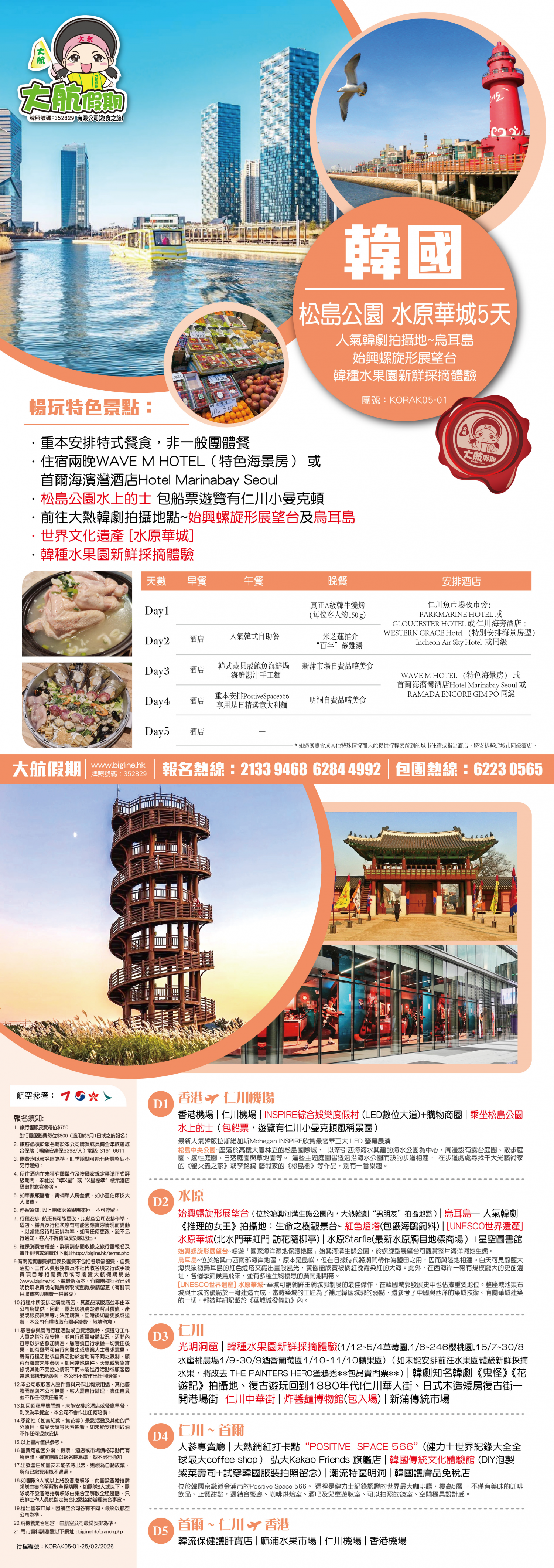 始興螺旋形展望台(位於始興河溝生態公園內,大熱韓劇“男朋友”拍攝地點) / 烏耳島─ 人氣韓劇《推理的女王》拍攝地:生命之樹觀景臺~ 紅色燈塔(包餵海鷗飼料) / [UNESCO世界遺產]水原華城(北水門華虹門-訪花隨柳亭)/水原Starfie(最新水原觸目地標商場)+星空圖書館