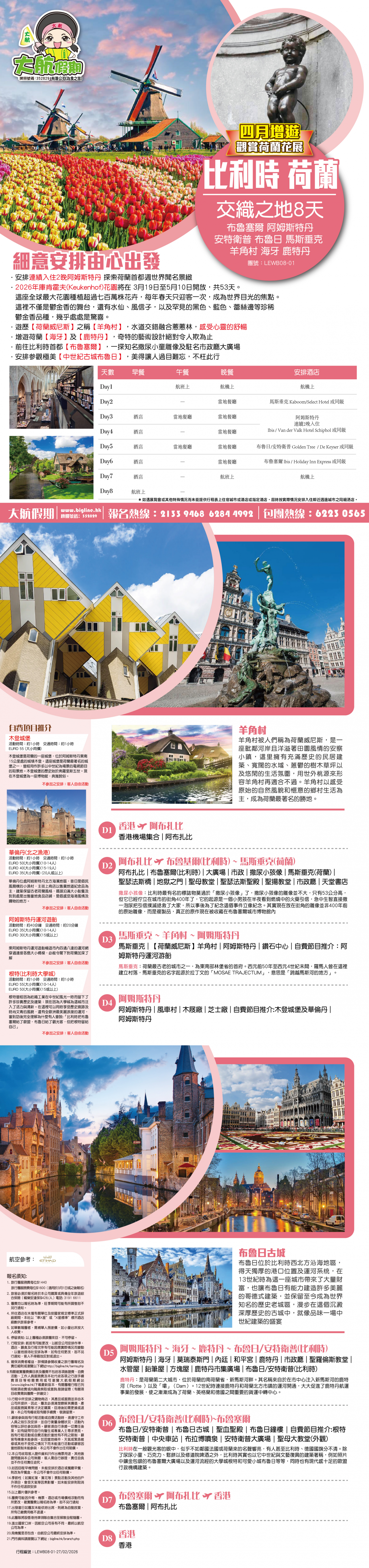 *團員繳付退票費後 (如適用): 1) 已繳款項可保留半年; 或 2) 選擇轉團後, 餘款則保留半年; 或 3) 可繳付『迫不得已理由』之手續費後, 取回已付餘款。 *個別機票+酒店套票產品如因『迫不得已理由』取消外遊行程, 處理旅客退款時亦按以上訂列收取每位退票費及手續費, 並以行程表 (套票單張) 所列為準。 責任細則: 1. 本公司保留合併團隊出發的權利。 2. 行程書或單張內所列費用根據當時機票價格及國際貨幣兌換率而訂立。外幣浮動等情況之下, 本公司保留在出發前調整各項費用的權利及徵收額外費用。 3. 所有列出的交通服務資料只供參考, 如有更改概不負責, 一切須以出票時為準。 4. 除本公司直接提供之服務外, 本公司及其職員或附屬公司或與本公司有經營關係之公司代理人身份在香港或外地安排其他獨立機構所提供之交通工具 (如飛機、輪船、火車、或遊覽巴士等) 、住宿、膳食或娛樂觀光項目等 (“委託機構”), 團員如遇交通延誤、行李遺失、意外傷亡或財物損失等, 該依照當地法律向擁有、管理或操作之委託機構直接交涉或追討賠償, 通常該等機構均各訂位不同條例, 以對客人負責。在此情況下, 本公司概不對該等損失或傷亡負責。 5. 除因由本公司之員工或其他直接管理或操作之機構之疏忽而引致團員之個人傷亡外, 本公司對團員在任何意外中之個人傷亡、經濟、娛樂或精神損失概不負責。 6. 除經本公司同意及安排, 如團員自行更改由其他人士代為參團, 本公司或其委託機構之職員有權取消其隨團之資格, 而無須發還任何團費, 而該人士在隨團期間之保險、責任賠償、行為後果等均由該人仕自行承擔。 7. 如因天氣、罷工、戰爭、怠工或安全情況影響而引致有關交通工具暫停服務, 停航或其他事故, 而必須將行程更改或取消部份行程, 本公司則將團員所繳交之費用扣除因以上事故而引致之損失後, 退回差額給團員。 8. 有關住宿、膳食、遊覽節目等問題, 均依據行程表安排, 行程先後次序有可能需要更改, 一切以當地安排為準。若遇特殊情況, 如簽證受阻, 當地酒店突告客滿或航機改變飛行時間或地點, 以及非本公司或其委託機構所能控制之因素, 令旅行團節目有增減, 或臨時更改交通工具、班機時間、機種及更換酒店等等, 本公司或其委託機構得依當時情況全權盡力處理, 團員不得藉故反對或退出, 因故取消之節目, 將不獲退還款項, 任何因延期而引致之額外支出, 本公司或其委託機構概不負責。 9. 所有酒店及住宿根據行程安排, 本公司視乎當時情形作出更改, 但不限於遇展覽會或特殊情況下, 將住宿鄰近城市之同等級酒店及住宿代替。本公司如因『迫不得已理由(外遊)』(即指戰爭、政治動盪、恐怖襲擊、天災、疫症、惡劣天氣、交通工具發生技術問題、載運機構臨時更改班次或取消服務、罷工、工業行動、旅遊目的地政府或世界衛生組織發出旅遊警示(警告)、香港特別行政區政府發出紅色或黑色外遊警示、不可抗力事件,以及業界不能控制的其他不利離開香港或在香港境外旅遊的情況)於外遊旅行團出發後更改任何項目而引致成本增加,可向顧客徵收額外費用。 10. 【已成團】代表該團號之指定出發日期預訂機位或已有足夠人數報名參加。但出發與否還受其他因素影響, 本公司保留最終決定權。 11. 任何團員在參與各項活動時, 如經常不遵守服飾人員之指引或安排, 在行動或言語上侮辱或滋擾其他團員或工作人員, 本公司或其委託機構職員有權視具體情況而取消其隨團資格而母須發任何團費, 而受該旅客監護之18歲以下同行團員亦須一併離開, 有關旅客離團後一切活動, 概與本公司或其委託機構無關。 12. 團員如欲於旅程完畢後延期返港, 須於出發前十四天提出, 以便本公司代為預定返港機位, 延期返港之機位, 未能即時作實, 團員不得藉此理由要求退出, 旅程完畢後延期逗留之費用, 概由團員自負。 13. 延期返港之團友, 必須在離境前七十二小時向航空公司確實回程機位, 任何機位如有變更, 概與本公司無關。 14. 團員如在旅途中自行離團或放棄行程, 離團後之責任自負, 一切後果與本公司或其委託機構無關。 15. 參團者須切實遵守各國及各地法例, 包括但不限於防疫防控條例, 並嚴禁攜帶違例物品出入境, 並照實申報攜帶之物品及現金。 16. 任何種類的簽證審批權及出入境批准權一律由該國或地區之領事館及/或出入境部門全權決定, 出入境如有問題, 責任旅客自負, 本公司或其委託機構母須負任何責任。如簽證已代辦, 簽證費恕不退還。 17. 即使團員持有效之入境簽證及旅遊證件, 而於入境時被當值之移民局海關人員拒絕入境, 本公司或其委託機構亦無須負任何責任。所需額外安排之食宿、交通費用、全部由其本人負責, 其餘下的行程亦將不會獲得任何補償, 亦不得要求退款或改團。 18. 中國內地相關法規規定, 即日起旅客入住中國內地境內酒店時, 公安機關會透過酒店前台向旅客一併採集人像信息資訊。 19. 如出現一些非本公司能力範圍可控制之問題 (如花卉、紅葉提早凋謝或景觀、自然現象、景點活動或戶外項目) 會受天氣等因素影響, 如未能安排則取消不作任何退款安排。 20. 旅客如在旅程中確診 COVID-19或其他傳染病,無論受到當地政府隔離或其他檢疫要求影響與否,為確保其他旅客之安全,確診旅