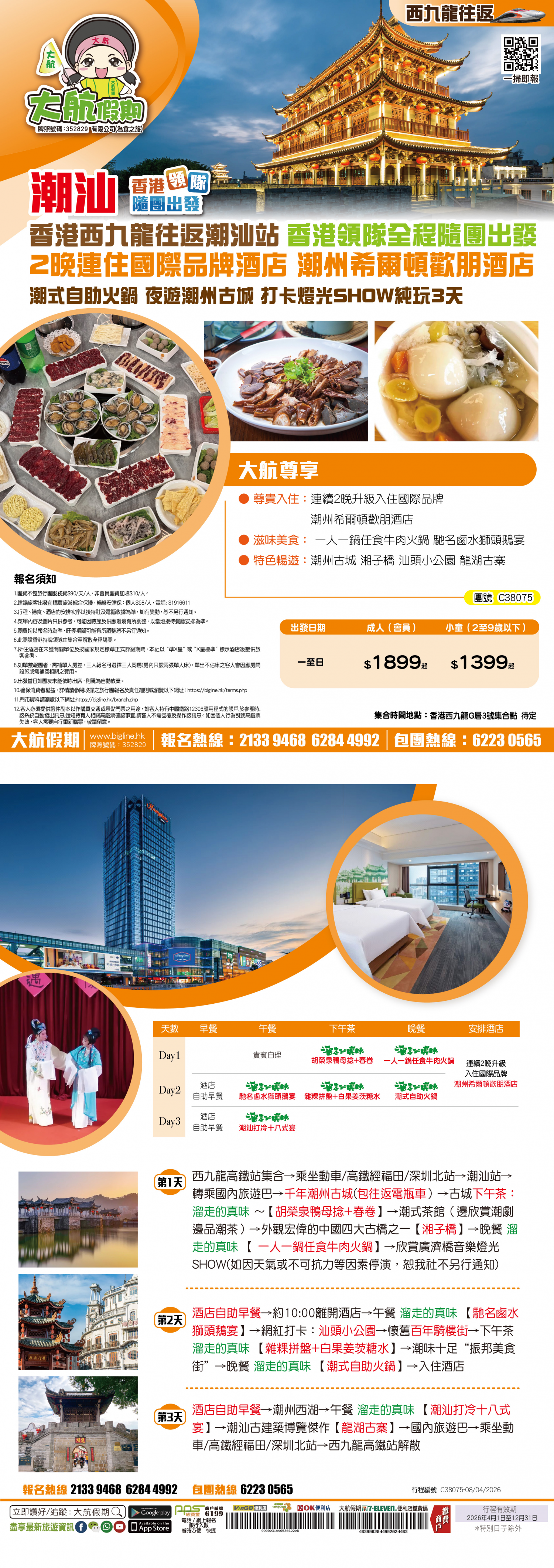 | 第2天 | 酒店自助早餐 | 澄海滷水獅頭鵝宴 | 潮式自助火鍋 | 潮州希爾頓歡朋酒店 |