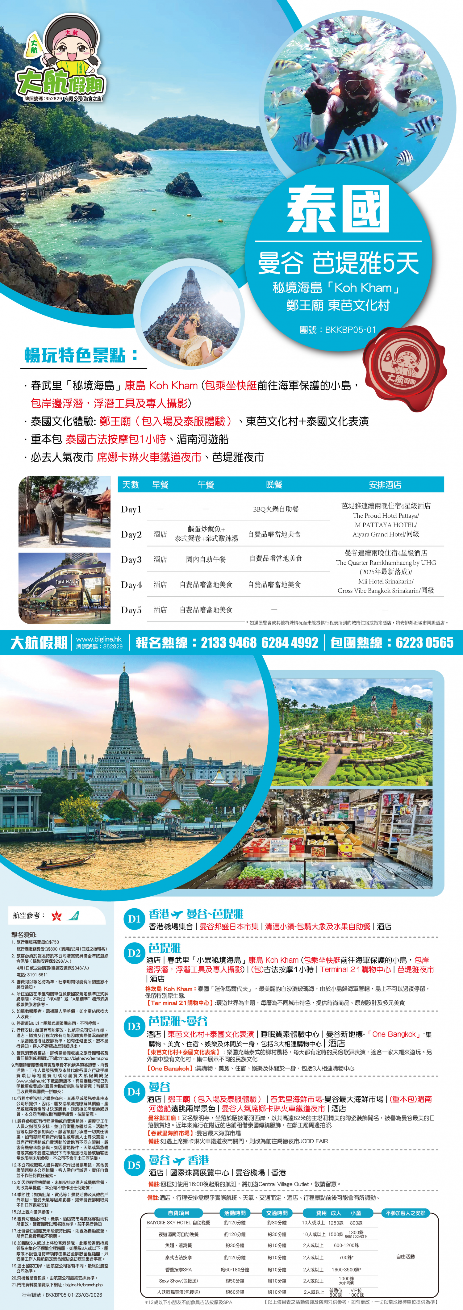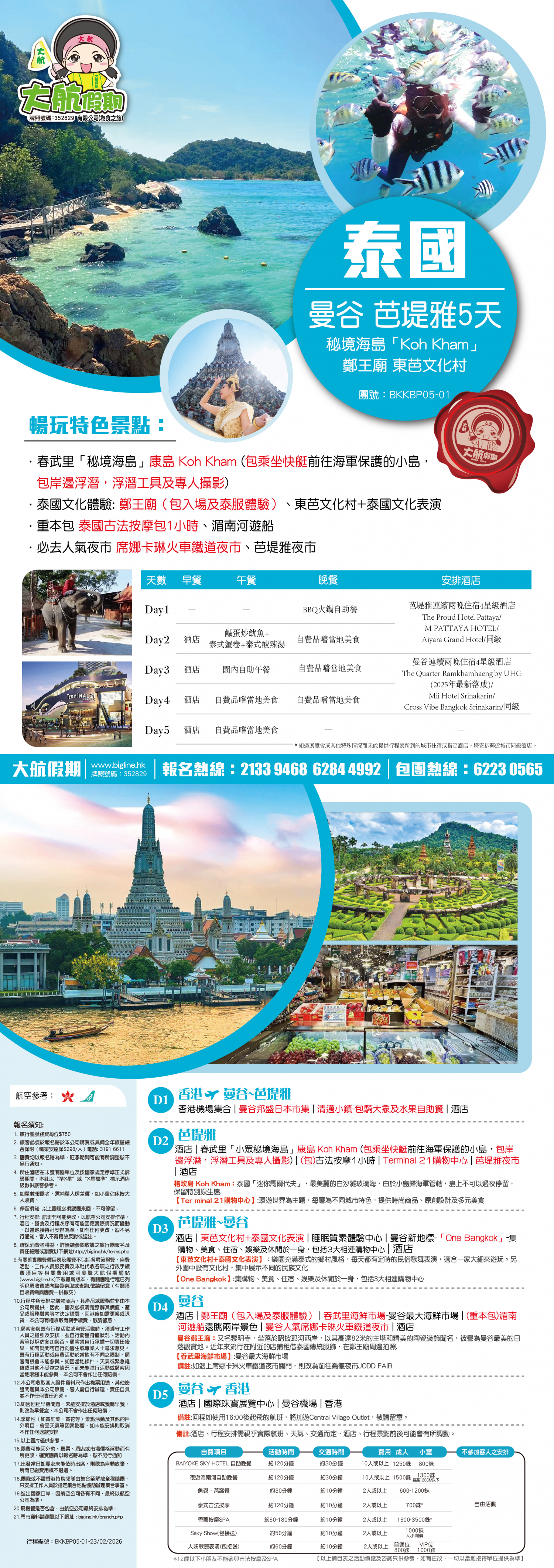 *團員繳付退票費後 (如適用): 1) 已繳款項可保留半年; 或 2) 選擇轉團後, 餘款則保留半年; 或 3) 可繳付『迫不得已理由』之手續費後, 取回已付餘款。 *個別機票+酒店套票產品如因『迫不得已理由』取消外遊行程, 處理旅客退款時亦按以上訂列收取每位退票費及手續費, 並以行程表 (套票單張) 所列為準。 責任細則: 1. 本公司保留合併團隊出發的權利。 2. 行程書或單張內所列費用根據當時機票價格及國際貨幣兌換率而訂立。外幣浮動等情況之下, 本公司保留在出發前調整各項費用的權利及徵收額外費用。 3. 所有列出的交通服務資料只供參考, 如有更改概不負責, 一切須以出票時為準。 4. 除本公司直接提供之服務外, 本公司及其職員或附屬公司或與本公司有經營關係之公司代理人身份在香港或外地安排其他獨立機構所提供之交通工具 (如飛機、輪船、火車、或遊覽巴士等) 、住宿、膳食或娛樂觀光項目等 (“委託機構”), 團員如遇交通延誤、行李遺失、意外傷亡或財物損失等, 該依照當地法律向擁有、管理或操作之委託機構直接交涉或追討賠償, 通常該等機構均各訂位不同條例, 以對客人負責。在此情況下, 本公司概不對該等損失或傷亡負責。 5. 除因由本公司之員工或其他直接管理或操作之機構之疏忽而引致團員之個人傷亡外, 本公司對團員在任何意外中之個人傷亡、經濟、娛樂或精神損失概不負責。 6. 除經本公司同意及安排, 如團員自行更改由其他人士代為參團, 本公司或其委託機構之職員有權取消其隨團之資格, 而無須發還任何團費, 而該人士在隨團期間之保險、責任賠償、行為後果等均由該人仕自行承擔。 7. 如因天氣、罷工、戰爭、怠工或安全情況影響而引致有關交通工具暫停服務, 停航或其他事故, 而必須將行程更改或取消部份行程, 本公司則將團員所繳交之費用扣除因以上事故而引致之損失後, 退回差額給團員。 8. 有關住宿、膳食、遊覽節目等問題, 均依據行程表安排, 行程先後次序有可能需要更改, 一切以當地安排為準。若遇特殊情況, 如簽證受阻, 當地酒店突告客滿或航機改變飛行時間或地點, 以及非本公司或其委託機構所能控制之因素, 令旅行團節目有增減, 或臨時更改交通工具、班機時間、機種及更換酒店等等, 本公司或其委託機構得依當時情況全權盡力處理, 團員不得藉故反對或退出, 因故取消之節目, 將不獲退還款項, 任何因延期而引致之額外支出, 本公司或其委託機構概不負責。 9. 所有酒店及住宿根據行程安排, 本公司視乎當時情形作出更改, 但不限於遇展覽會或特殊情況下, 將住宿鄰近城市之同等級酒店及住宿代替。本公司如因『迫不得已理由(外遊)』(即指戰爭、政治動盪、恐怖襲擊、天災、疫症、惡劣天氣、交通工具發生技術問題、載運機構臨時更改班次或取消服務、罷工、工業行動、旅遊目的地政府或世界衛生組織發出旅遊警示(警告)、香港特別行政區政府發出紅色或黑色外遊警示、不可抗力事件,以及業界不能控制的其他不利離開香港或在香港境外旅遊的情況)於外遊旅行團出發後更改任何項目而引致成本增加,可向顧客徵收額外費用。 10. 【已成團】代表該團號之指定出發日期預訂機位或已有足夠人數報名參加。但出發與否還受其他因素影響, 本公司保留最終決定權。 11. 任何團員在參與各項活動時, 如經常不遵守服飾人員之指引或安排, 在行動或言語上侮辱或滋擾其他團員或工作人員, 本公司或其委託機構職員有權視具體情況而取消其隨團資格而母須發任何團費, 而受該旅客監護之18歲以下同行團員亦須一併離開, 有關旅客離團後一切活動, 概與本公司或其委託機構無關。 12. 團員如欲於旅程完畢後延期返港, 須於出發前十四天提出, 以便本公司代為預定返港機位, 延期返港之機位, 未能即時作實, 團員不得藉此理由要求退出, 旅程完畢後延期逗留之費用, 概由團員自負。 13. 延期返港之團友, 必須在離境前七十二小時向航空公司確實回程機位, 任何機位如有變更, 概與本公司無關。 14. 團員如在旅途中自行離團或放棄行程, 離團後之責任自負, 一切後果與本公司或其委託機構無關。 15. 參團者須切實遵守各國及各地法例, 包括但不限於防疫防控條例, 並嚴禁攜帶違例物品出入境, 並照實申報攜帶之物品及現金。 16. 任何種類的簽證審批權及出入境批准權一律由該國或地區之領事館及/或出入境部門全權決定, 出入境如有問題, 責任旅客自負, 本公司或其委託機構母須負任何責任。如簽證已代辦, 簽證費恕不退還。 17. 即使團員持有效之入境簽證及旅遊證件, 而於入境時被當值之移民局海關人員拒絕入境, 本公司或其委託機構亦無須負任何責任。所需額外安排之食宿、交通費用、全部由其本人負責, 其餘下的行程亦將不會獲得任何補償, 亦不得要求退款或改團。 18. 中國內地相關法規規定, 即日起旅客入住中國內地境內酒店時, 公安機關會透過酒店前台向旅客一併採集人像信息資訊。 19. 如出現一些非本公司能力範圍可控制之問題 (如花卉、紅葉提早凋謝或景觀、自然現象、景點活動或戶外項目) 會受天氣等因素影響, 如未能安排則取消不作任何退款安排。 20. 旅客如在旅程中確診 COVID-19或其他傳染病,無論受到當地政府隔離或其他檢疫要求影響與否,為確保其他旅客之安全,確診旅