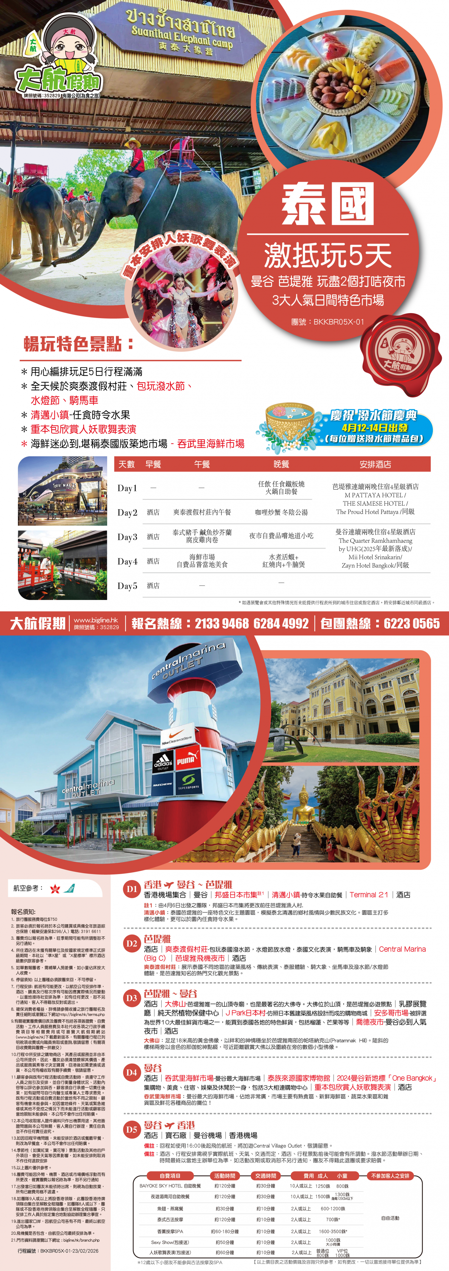 香港機場集合│曼谷│邦盛日本市集(註1)│清邁小鎮-泰國時令水果自助餐│Terminal 21│酒店 (註1.由4月6日出發之團隊,邦盛日本市集將更改前往芭堤雅漁人村.)