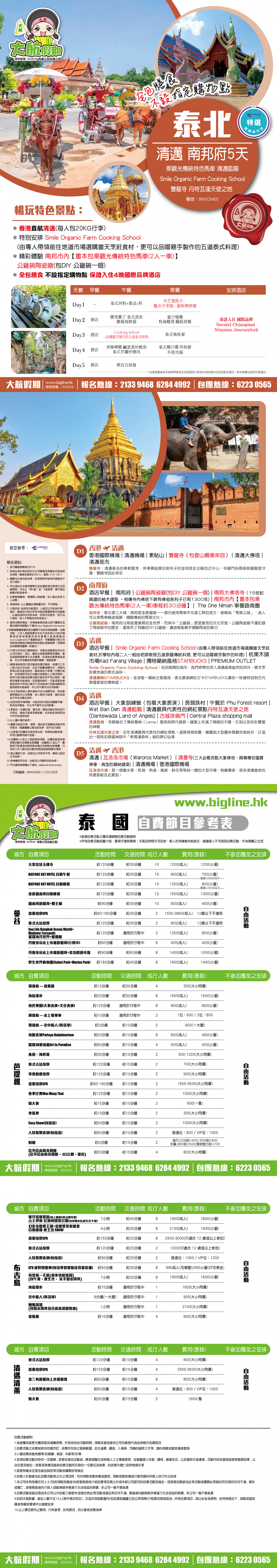 酒店早餐 | Smile Organic Farm Cooking School(由專人帶領前往地道市場選購當天烹飪食材,於學校內每二人一組由老師教授五道泰國傳統料理, 更可以品嚐親手製作的料理) | 杭東木頭市場Kad Farang Village | 獨特蘭納風格STARBUCKS | PREMIUM OUTLET
