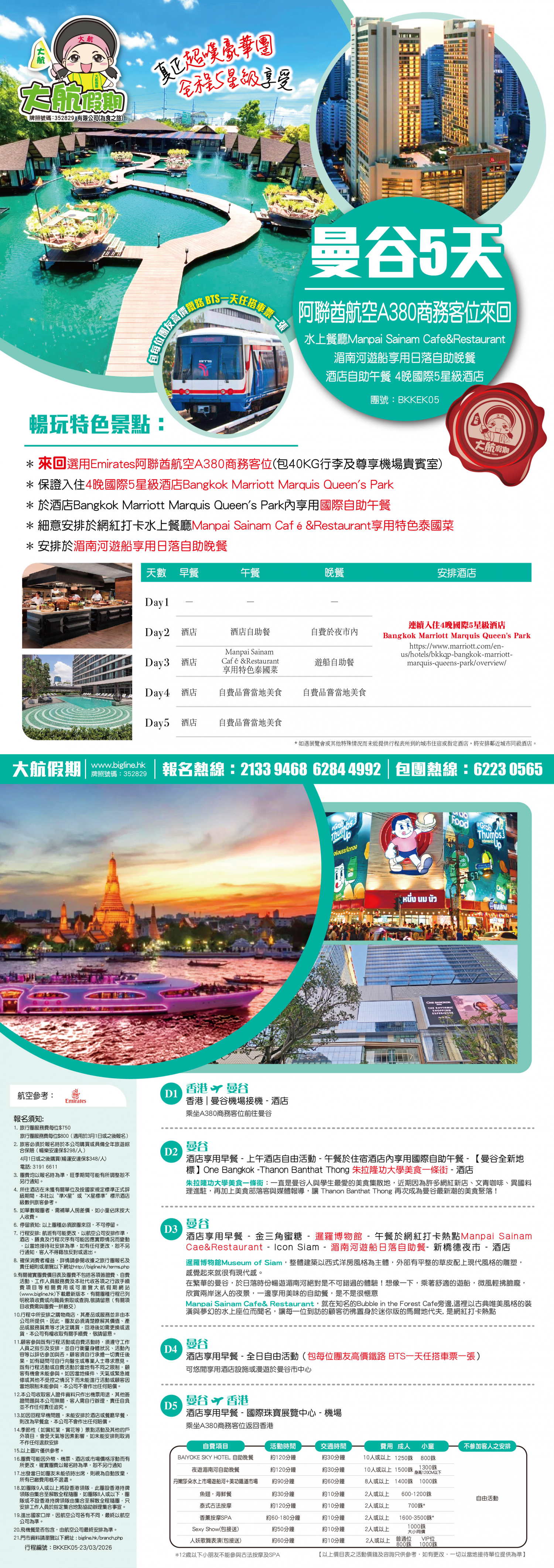 *團員繳付退票費後 (如適用): 1) 已繳款項可保留半年; 或 2) 選擇轉團後, 餘款則保留半年; 或 3) 可繳付『迫不得已理由』之手續費後, 取回已付餘款。 *個別機票+酒店套票產品如因『迫不得已理由』取消外遊行程, 處理旅客退款時亦按以上訂列收取每位退票費及手續費, 並以行程表 (套票單張) 所列為準。 責任細則: 1. 本公司保留合併團隊出發的權利。 2. 行程書或單張內所列費用根據當時機票價格及國際貨幣兌換率而訂立。外幣浮動等情況之下, 本公司保留在出發前調整各項費用的權利及徵收額外費用。 3. 所有列出的交通服務資料只供參考, 如有更改概不負責, 一切須以出票時為準。 4. 除本公司直接提供之服務外, 本公司及其職員或附屬公司或與本公司有經營關係之公司代理人身份在香港或外地安排其他獨立機構所提供之交通工具 (如飛機、輪船、火車、或遊覽巴士等) 、住宿、膳食或娛樂觀光項目等 (“委託機構”), 團員如遇交通延誤、行李遺失、意外傷亡或財物損失等, 該依照當地法律向擁有、管理或操作之委託機構直接交涉或追討賠償, 通常該等機構均各訂位不同條例, 以對客人負責。在此情況下, 本公司概不對該等損失或傷亡負責。 5. 除因由本公司之員工或其他直接管理或操作之機構之疏忽而引致團員之個人傷亡外, 本公司對團員在任何意外中之個人傷亡、經濟、娛樂或精神損失概不負責。 6. 除經本公司同意及安排, 如團員自行更改由其他人士代為參團, 本公司或其委託機構之職員有權取消其隨團之資格, 而無須發還任何團費, 而該人士在隨團期間之保險、責任賠償、行為後果等均由該人仕自行承擔。 7. 如因天氣、罷工、戰爭、怠工或安全情況影響而引致有關交通工具暫停服務, 停航或其他事故, 而必須將行程更改或取消部份行程, 本公司則將團員所繳交之費用扣除因以上事故而引致之損失後, 退回差額給團員。 8. 有關住宿、膳食、遊覽節目等問題, 均依據行程表安排, 行程先後次序有可能需要更改, 一切以當地安排為準。若遇特殊情況, 如簽證受阻, 當地酒店突告客滿或航機改變飛行時間或地點, 以及非本公司或其委託機構所能控制之因素, 令旅行團節目有增減, 或臨時更改交通工具、班機時間、機種及更換酒店等等, 本公司或其委託機構得依當時情況全權盡力處理, 團員不得藉故反對或退出, 因故取消之節目, 將不獲退還款項, 任何因延期而引致之額外支出, 本公司或其委託機構概不負責。 9. 所有酒店及住宿根據行程安排, 本公司視乎當時情形作出更改, 但不限於遇展覽會或特殊情況下, 將住宿鄰近城市之同等級酒店及住宿代替。本公司如因『迫不得已理由(外遊)』(即指戰爭、政治動盪、恐怖襲擊、天災、疫症、惡劣天氣、交通工具發生技術問題、載運機構臨時更改班次或取消服務、罷工、工業行動、旅遊目的地政府或世界衛生組織發出旅遊警示(警告)、香港特別行政區政府發出紅色或黑色外遊警示、不可抗力事件,以及業界不能控制的其他不利離開香港或在香港境外旅遊的情況)於外遊旅行團出發後更改任何項目而引致成本增加,可向顧客徵收額外費用。 10. 【已成團】代表該團號之指定出發日期預訂機位或已有足夠人數報名參加。但出發與否還受其他因素影響, 本公司保留最終決定權。 11. 任何團員在參與各項活動時, 如經常不遵守服飾人員之指引或安排, 在行動或言語上侮辱或滋擾其他團員或工作人員, 本公司或其委託機構職員有權視具體情況而取消其隨團資格而母須發任何團費, 而受該旅客監護之18歲以下同行團員亦須一併離開, 有關旅客離團後一切活動, 概與本公司或其委託機構無關。 12. 團員如欲於旅程完畢後延期返港, 須於出發前十四天提出, 以便本公司代為預定返港機位, 延期返港之機位, 未能即時作實, 團員不得藉此理由要求退出, 旅程完畢後延期逗留之費用, 概由團員自負。 13. 延期返港之團友, 必須在離境前七十二小時向航空公司確實回程機位, 任何機位如有變更, 概與本公司無關。 14. 團員如在旅途中自行離團或放棄行程, 離團後之責任自負, 一切後果與本公司或其委託機構無關。 15. 參團者須切實遵守各國及各地法例, 包括但不限於防疫防控條例, 並嚴禁攜帶違例物品出入境, 並照實申報攜帶之物品及現金。 16. 任何種類的簽證審批權及出入境批准權一律由該國或地區之領事館及/或出入境部門全權決定, 出入境如有問題, 責任旅客自負, 本公司或其委託機構母須負任何責任。如簽證已代辦, 簽證費恕不退還。 17. 即使團員持有效之入境簽證及旅遊證件, 而於入境時被當值之移民局海關人員拒絕入境, 本公司或其委託機構亦無須負任何責任。所需額外安排之食宿、交通費用、全部由其本人負責, 其餘下的行程亦將不會獲得任何補償, 亦不得要求退款或改團。 18. 中國內地相關法規規定, 即日起旅客入住中國內地境內酒店時, 公安機關會透過酒店前台向旅客一併採集人像信息資訊。 19. 如出現一些非本公司能力範圍可控制之問題 (如花卉、紅葉提早凋謝或景觀、自然現象、景點活動或戶外項目) 會受天氣等因素影響, 如未能安排則取消不作任何退款安排。 20. 旅客如在旅程中確診 COVID-19或其他傳染病,無論受到當地政府隔離或其他檢疫要求影響與否,為確保其他旅客之安全,確診旅