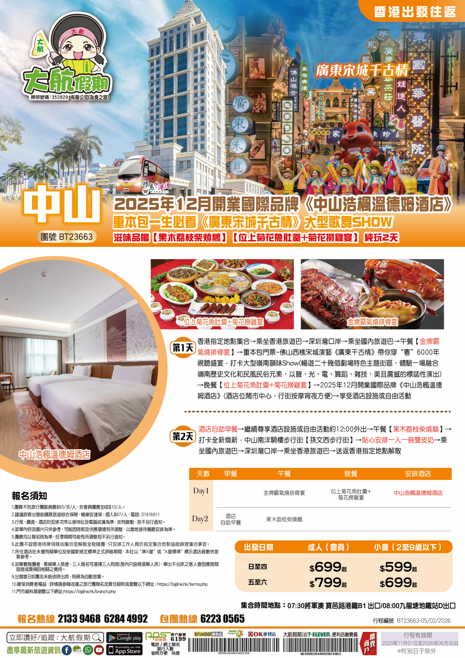 | 第1天 | 金牌霸氣燒排骨宴 | 位上菊花魚肚羹+菊花撈雞宴 | 中山浩楓溫德姆酒店 | |