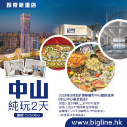 【探索新酒店】2026年3月全新開業鬧市中心國際品牌《中山中心華邑酒店》保證入住35樓以上約450呎客房 豪嘆【酒店47樓海鮮自助晚餐】皇牌推介<位上冰鎮菊花(六頭)鮑魚><鴻運荔枝柴鳳凰宴>純玩2天