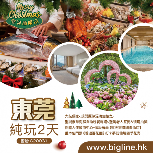 【聖誕節限定】大航獨家<現開原條深海金槍魚·聖誕豪華海鮮自助晚餐專場>聖誕老人互動&現場抽獎 保證入住鬧市中心~頂級奢華【東莞東城國際酒店】重本包門票《香遇百花園》打卡夢幻仙境四季花海 純玩2天