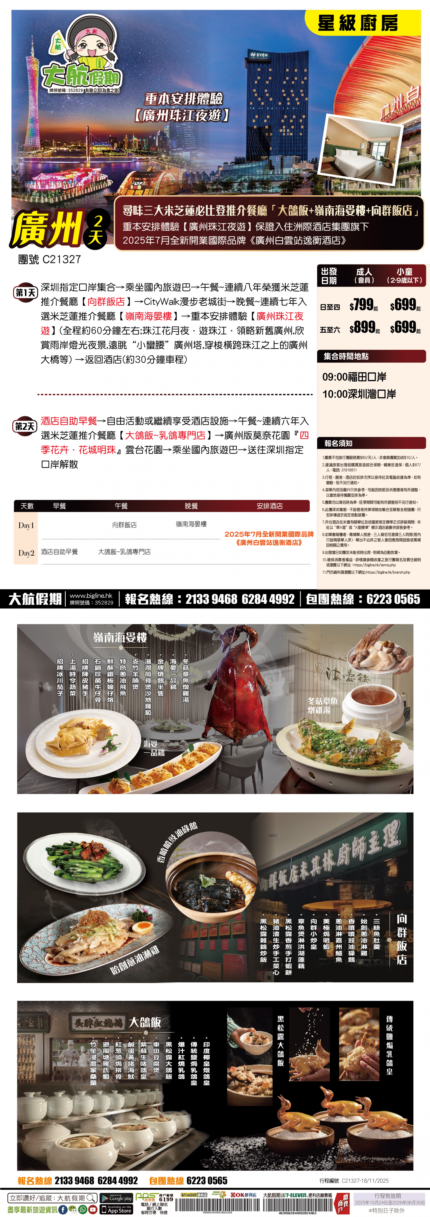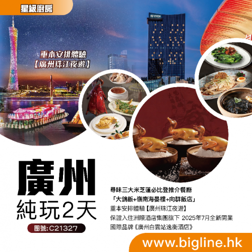 | 第1天 | 連續八年蟬聯米芝蓮推介餐廳【向群飯店】 | 連續七年榮獲米芝蓮推介餐廳【嶺南海晏樓】 | 廣州白雲站逸衡酒店 | |