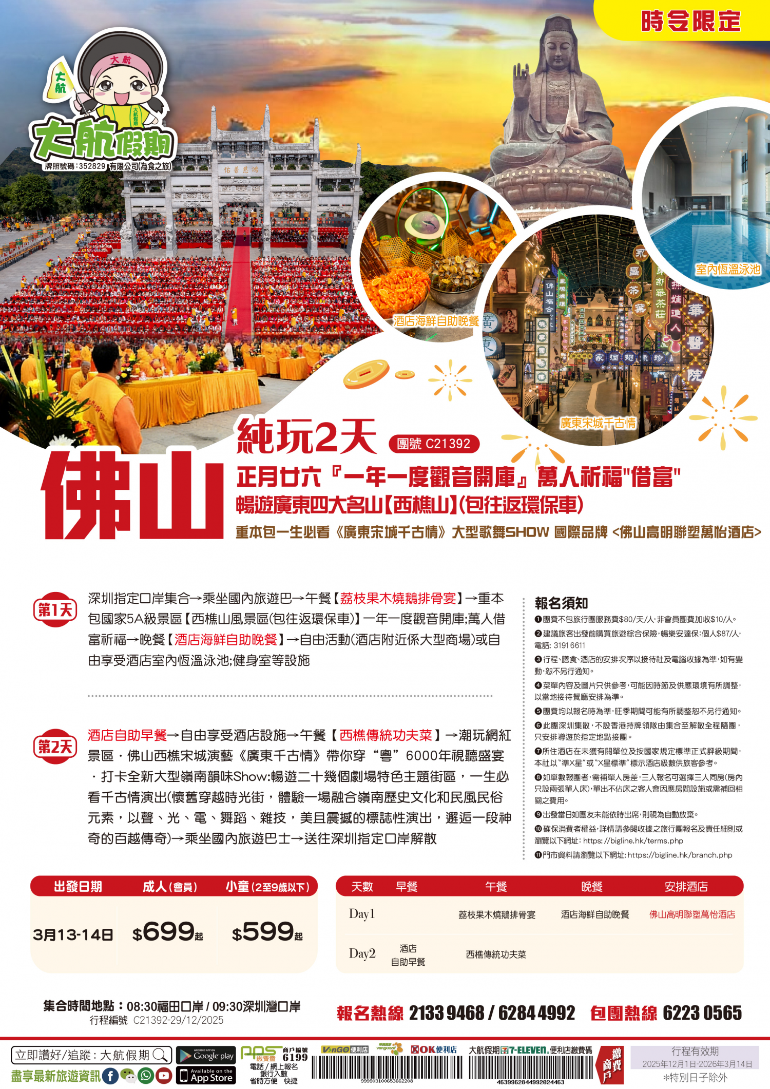 *團員繳付退票費後 (如適用): 1) 已繳款項可保留半年; 或 2) 選擇轉團後, 餘款則保留半年; 或 3) 可繳付『迫不得已理由』之手續費後, 取回已付餘款。 *個別機票+酒店套票產品如因『迫不得已理由』取消外遊行程, 處理旅客退款時亦按以上訂列收取每位退票費及手續費, 並以行程表 (套票單張) 所列為準。 責任細則: 1. 本公司保留合併團隊出發的權利。 2. 行程書或單張內所列費用根據當時機票價格及國際貨幣兌換率而訂立。外幣浮動等情況之下, 本公司保留在出發前調整各項費用的權利及徵收額外費用。 3. 所有列出的交通服務資料只供參考, 如有更改概不負責, 一切須以出票時為準。 4. 除本公司直接提供之服務外, 本公司及其職員或附屬公司或與本公司有經營關係之公司代理人身份在香港或外地安排其他獨立機構所提供之交通工具 (如飛機、輪船、火車、或遊覽巴士等) 、住宿、膳食或娛樂觀光項目等 (“委託機構”), 團員如遇交通延誤、行李遺失、意外傷亡或財物損失等, 該依照當地法律向擁有、管理或操作之委託機構直接交涉或追討賠償, 通常該等機構均各訂位不同條例, 以對客人負責。在此情況下, 本公司概不對該等損失或傷亡負責。 5. 除因由本公司之員工或其他直接管理或操作之機構之疏忽而引致團員之個人傷亡外, 本公司對團員在任何意外中之個人傷亡、經濟、娛樂或精神損失概不負責。 6. 除經本公司同意及安排, 如團員自行更改由其他人士代為參團, 本公司或其委託機構之職員有權取消其隨團之資格, 而無須發還任何團費, 而該人士在隨團期間之保險、責任賠償、行為後果等均由該人仕自行承擔。 7. 如因天氣、罷工、戰爭、怠工或安全情況影響而引致有關交通工具暫停服務, 停航或其他事故, 而必須將行程更改或取消部份行程, 本公司則將團員所繳交之費用扣除因以上事故而引致之損失後, 退回差額給團員。 8. 有關住宿、膳食、遊覽節目等問題, 均依據行程表安排, 行程先後次序有可能需要更改, 一切以當地安排為準。若遇特殊情況, 如簽證受阻, 當地酒店突告客滿或航機改變飛行時間或地點, 以及非本公司或其委託機構所能控制之因素, 令旅行團節目有增減, 或臨時更改交通工具、班機時間、機種及更換酒店等等, 本公司或其委託機構得依當時情況全權盡力處理, 團員不得藉故反對或退出, 因故取消之節目, 將不獲退還款項, 任何因延期而引致之額外支出, 本公司或其委託機構概不負責。 9. 所有酒店及住宿根據行程安排, 本公司視乎當時情形作出更改, 但不限於遇展覽會或特殊情況下, 將住宿鄰近城市之同等級酒店及住宿代替。本公司如因『迫不得已理由(外遊)』(即指戰爭、政治動盪、恐怖襲擊、天災、疫症、惡劣天氣、交通工具發生技術問題、載運機構臨時更改班次或取消服務、罷工、工業行動、旅遊目的地政府或世界衛生組織發出旅遊警示(警告)、香港特別行政區政府發出紅色或黑色外遊警示、不可抗力事件,以及業界不能控制的其他不利離開香港或在香港境外旅遊的情況)於外遊旅行團出發後更改任何項目而引致成本增加,可向顧客徵收額外費用。 10. 【已成團】代表該團號之指定出發日期預訂機位或已有足夠人數報名參加。但出發與否還受其他因素影響, 本公司保留最終決定權。 11. 任何團員在參與各項活動時, 如經常不遵守服飾人員之指引或安排, 在行動或言語上侮辱或滋擾其他團員或工作人員, 本公司或其委託機構職員有權視具體情況而取消其隨團資格而母須發任何團費, 而受該旅客監護之18歲以下同行團員亦須一併離開, 有關旅客離團後一切活動, 概與本公司或其委託機構無關。 12. 團員如欲於旅程完畢後延期返港, 須於出發前十四天提出, 以便本公司代為預定返港機位, 延期返港之機位, 未能即時作實, 團員不得藉此理由要求退出, 旅程完畢後延期逗留之費用, 概由團員自負。 13. 延期返港之團友, 必須在離境前七十二小時向航空公司確實回程機位, 任何機位如有變更, 概與本公司無關。 14. 團員如在旅途中自行離團或放棄行程, 離團後之責任自負, 一切後果與本公司或其委託機構無關。 15. 參團者須切實遵守各國及各地法例, 包括但不限於防疫防控條例, 並嚴禁攜帶違例物品出入境, 並照實申報攜帶之物品及現金。 16. 任何種類的簽證審批權及出入境批准權一律由該國或地區之領事館及/或出入境部門全權決定, 出入境如有問題, 責任旅客自負, 本公司或其委託機構母須負任何責任。如簽證已代辦, 簽證費恕不退還。 17. 即使團員持有效之入境簽證及旅遊證件, 而於入境時被當值之移民局海關人員拒絕入境, 本公司或其委託機構亦無須負任何責任。所需額外安排之食宿、交通費用、全部由其本人負責, 其餘下的行程亦將不會獲得任何補償, 亦不得要求退款或改團。 18. 中國內地相關法規規定, 即日起旅客入住中國內地境內酒店時, 公安機關會透過酒店前台向旅客一併採集人像信息資訊。 19. 如出現一些非本公司能力範圍可控制之問題 (如花卉、紅葉提早凋謝或景觀、自然現象、景點活動或戶外項目) 會受天氣等因素影響, 如未能安排則取消不作任何退款安排。 20. 旅客如在旅程中確診 COVID-19或其他傳染病,無論受到當地政府隔離或其他檢疫要求影響與否,為確保其他旅客之安全,確診旅
