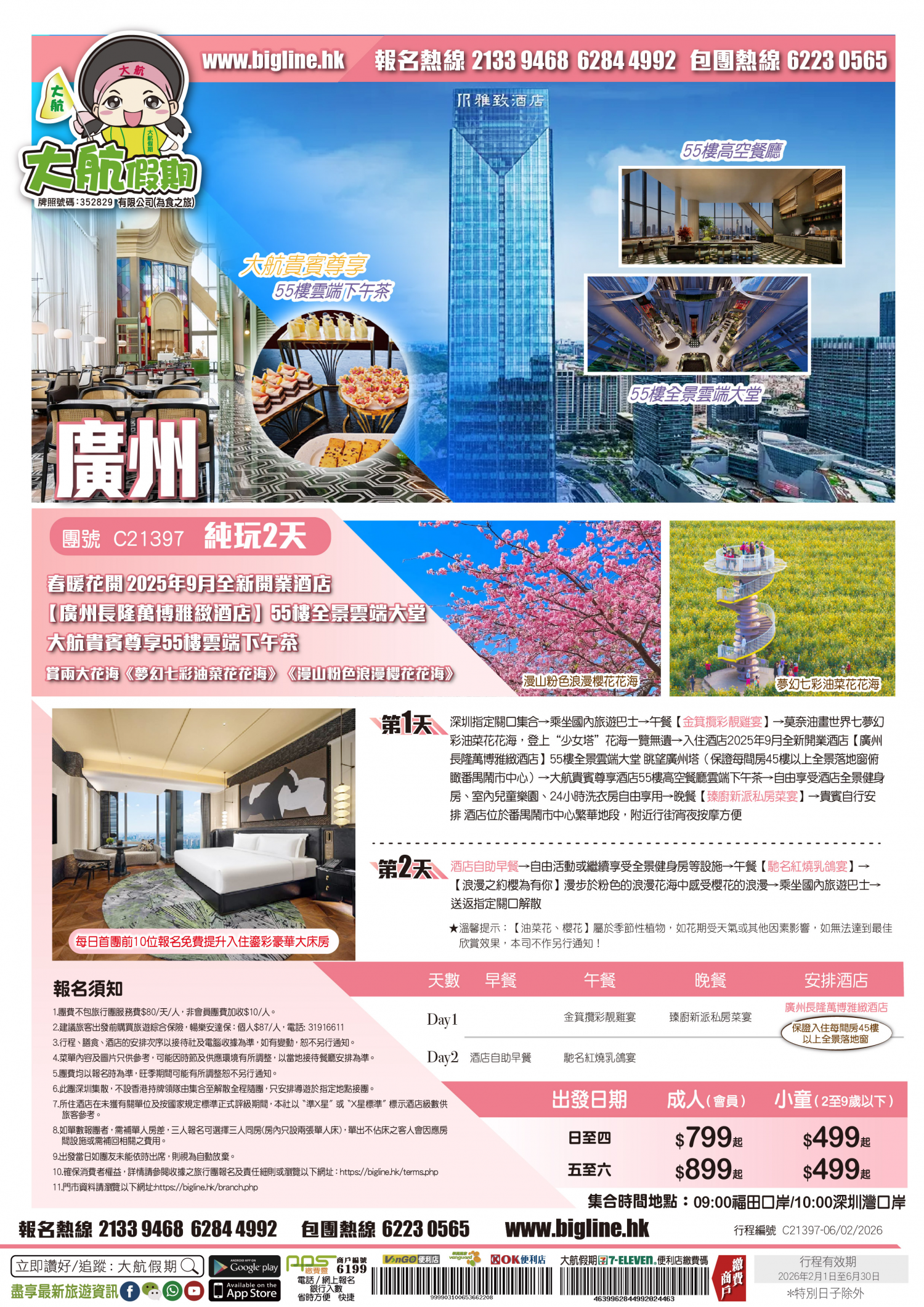 *團員繳付退票費後 (如適用): 1) 已繳款項可保留半年; 或 2) 選擇轉團後, 餘款則保留半年; 或 3) 可繳付『迫不得已理由』之手續費後, 取回已付餘款。 *個別機票+酒店套票產品如因『迫不得已理由』取消外遊行程, 處理旅客退款時亦按以上訂列收取每位退票費及手續費, 並以行程表 (套票單張) 所列為準。 責任細則: 1. 本公司保留合併團隊出發的權利。 2. 行程書或單張內所列費用根據當時機票價格及國際貨幣兌換率而訂立。外幣浮動等情況之下, 本公司保留在出發前調整各項費用的權利及徵收額外費用。 3. 所有列出的交通服務資料只供參考, 如有更改概不負責, 一切須以出票時為準。 4. 除本公司直接提供之服務外, 本公司及其職員或附屬公司或與本公司有經營關係之公司代理人身份在香港或外地安排其他獨立機構所提供之交通工具 (如飛機、輪船、火車、或遊覽巴士等) 、住宿、膳食或娛樂觀光項目等 (“委託機構”), 團員如遇交通延誤、行李遺失、意外傷亡或財物損失等, 該依照當地法律向擁有、管理或操作之委託機構直接交涉或追討賠償, 通常該等機構均各訂位不同條例, 以對客人負責。在此情況下, 本公司概不對該等損失或傷亡負責。 5. 除因由本公司之員工或其他直接管理或操作之機構之疏忽而引致團員之個人傷亡外, 本公司對團員在任何意外中之個人傷亡、經濟、娛樂或精神損失概不負責。 6. 除經本公司同意及安排, 如團員自行更改由其他人士代為參團, 本公司或其委託機構之職員有權取消其隨團之資格, 而無須發還任何團費, 而該人士在隨團期間之保險、責任賠償、行為後果等均由該人仕自行承擔。 7. 如因天氣、罷工、戰爭、怠工或安全情況影響而引致有關交通工具暫停服務, 停航或其他事故, 而必須將行程更改或取消部份行程, 本公司則將團員所繳交之費用扣除因以上事故而引致之損失後, 退回差額給團員。 8. 有關住宿、膳食、遊覽節目等問題, 均依據行程表安排, 行程先後次序有可能需要更改, 一切以當地安排為準。若遇特殊情況, 如簽證受阻, 當地酒店突告客滿或航機改變飛行時間或地點, 以及非本公司或其委託機構所能控制之因素, 令旅行團節目有增減, 或臨時更改交通工具、班機時間、機種及更換酒店等等, 本公司或其委託機構得依當時情況全權盡力處理, 團員不得藉故反對或退出, 因故取消之節目, 將不獲退還款項, 任何因延期而引致之額外支出, 本公司或其委託機構概不負責。 9. 所有酒店及住宿根據行程安排, 本公司視乎當時情形作出更改, 但不限於遇展覽會或特殊情況下, 將住宿鄰近城市之同等級酒店及住宿代替。本公司如因『迫不得已理由(外遊)』(即指戰爭、政治動盪、恐怖襲擊、天災、疫症、惡劣天氣、交通工具發生技術問題、載運機構臨時更改班次或取消服務、罷工、工業行動、旅遊目的地政府或世界衛生組織發出旅遊警示(警告)、香港特別行政區政府發出紅色或黑色外遊警示、不可抗力事件,以及業界不能控制的其他不利離開香港或在香港境外旅遊的情況)於外遊旅行團出發後更改任何項目而引致成本增加,可向顧客徵收額外費用。 10. 【已成團】代表該團號之指定出發日期預訂機位或已有足夠人數報名參加。但出發與否還受其他因素影響, 本公司保留最終決定權。 11. 任何團員在參與各項活動時, 如經常不遵守服飾人員之指引或安排, 在行動或言語上侮辱或滋擾其他團員或工作人員, 本公司或其委託機構職員有權視具體情況而取消其隨團資格而母須發任何團費, 而受該旅客監護之18歲以下同行團員亦須一併離開, 有關旅客離團後一切活動, 概與本公司或其委託機構無關。 12. 團員如欲於旅程完畢後延期返港, 須於出發前十四天提出, 以便本公司代為預定返港機位, 延期返港之機位, 未能即時作實, 團員不得藉此理由要求退出, 旅程完畢後延期逗留之費用, 概由團員自負。 13. 延期返港之團友, 必須在離境前七十二小時向航空公司確實回程機位, 任何機位如有變更, 概與本公司無關。 14. 團員如在旅途中自行離團或放棄行程, 離團後之責任自負, 一切後果與本公司或其委託機構無關。 15. 參團者須切實遵守各國及各地法例, 包括但不限於防疫防控條例, 並嚴禁攜帶違例物品出入境, 並照實申報攜帶之物品及現金。 16. 任何種類的簽證審批權及出入境批准權一律由該國或地區之領事館及/或出入境部門全權決定, 出入境如有問題, 責任旅客自負, 本公司或其委託機構母須負任何責任。如簽證已代辦, 簽證費恕不退還。 17. 即使團員持有效之入境簽證及旅遊證件, 而於入境時被當值之移民局海關人員拒絕入境, 本公司或其委託機構亦無須負任何責任。所需額外安排之食宿、交通費用、全部由其本人負責, 其餘下的行程亦將不會獲得任何補償, 亦不得要求退款或改團。 18. 中國內地相關法規規定, 即日起旅客入住中國內地境內酒店時, 公安機關會透過酒店前台向旅客一併採集人像信息資訊。 19. 如出現一些非本公司能力範圍可控制之問題 (如花卉、紅葉提早凋謝或景觀、自然現象、景點活動或戶外項目) 會受天氣等因素影響, 如未能安排則取消不作任何退款安排。 20. 旅客如在旅程中確診 COVID-19或其他傳染病,無論受到當地政府隔離或其他檢疫要求影響與否,為確保其他旅客之安全,確診旅