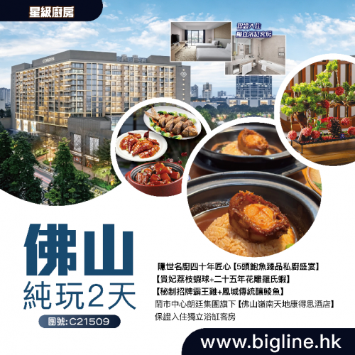 【星級廚房】大航假期X天悅集團X美食盛宴 港人口碑至讚<位上鮑汁8頭鮑魚+瑤柱花膠鳳凰羹><堂做仙鶴神針紅燒鴿吞佛跳牆>連住兩晚天悅集團豬肉婆旗下2026年1月全新開業【佛山柏希酒店】純玩3天