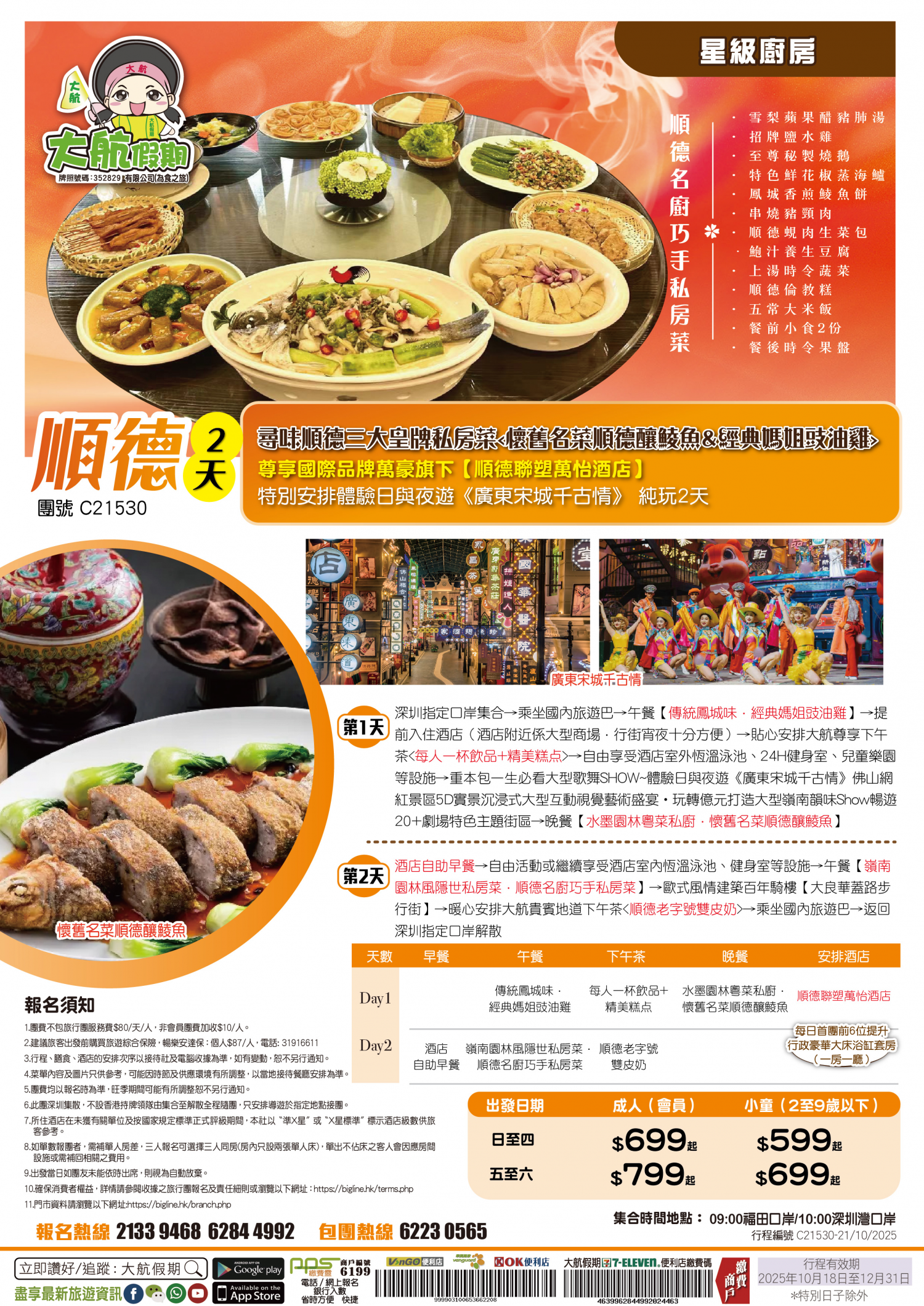 | 第1天 | 傳統鳳城味·經典媽姐豉油雞 | 水墨園林粵菜私廚·懷舊名菜順德釀鯪魚 | 佛山順德聯塑萬怡酒店 | |